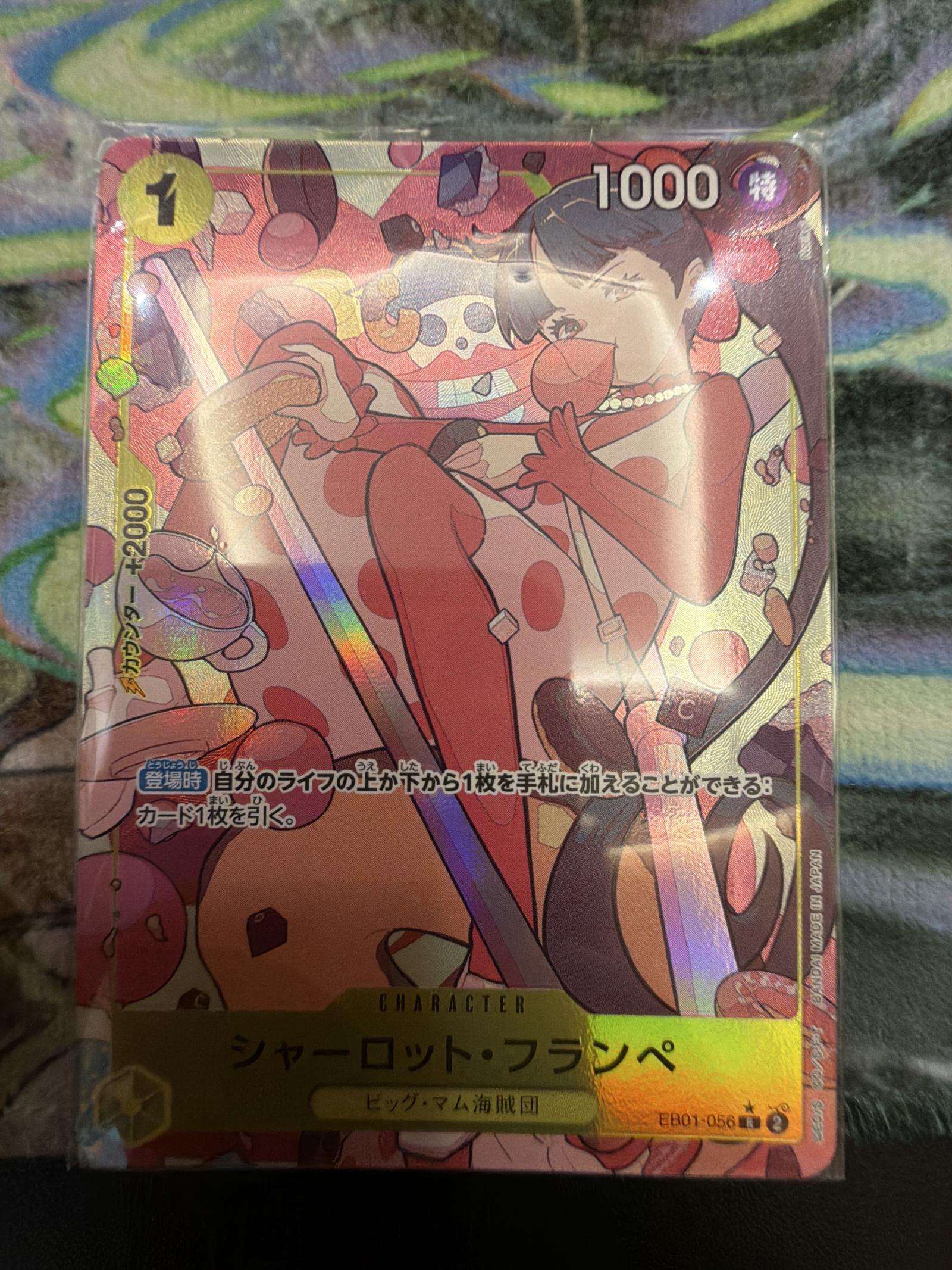 A holographic rare character card featuring Charlotte Flampe from the Big Mom Pirates in the One Piece Trading Card Game. This card is part of set EB01 and shows detailed artwork with vibrant colors. Text is in Japanese.