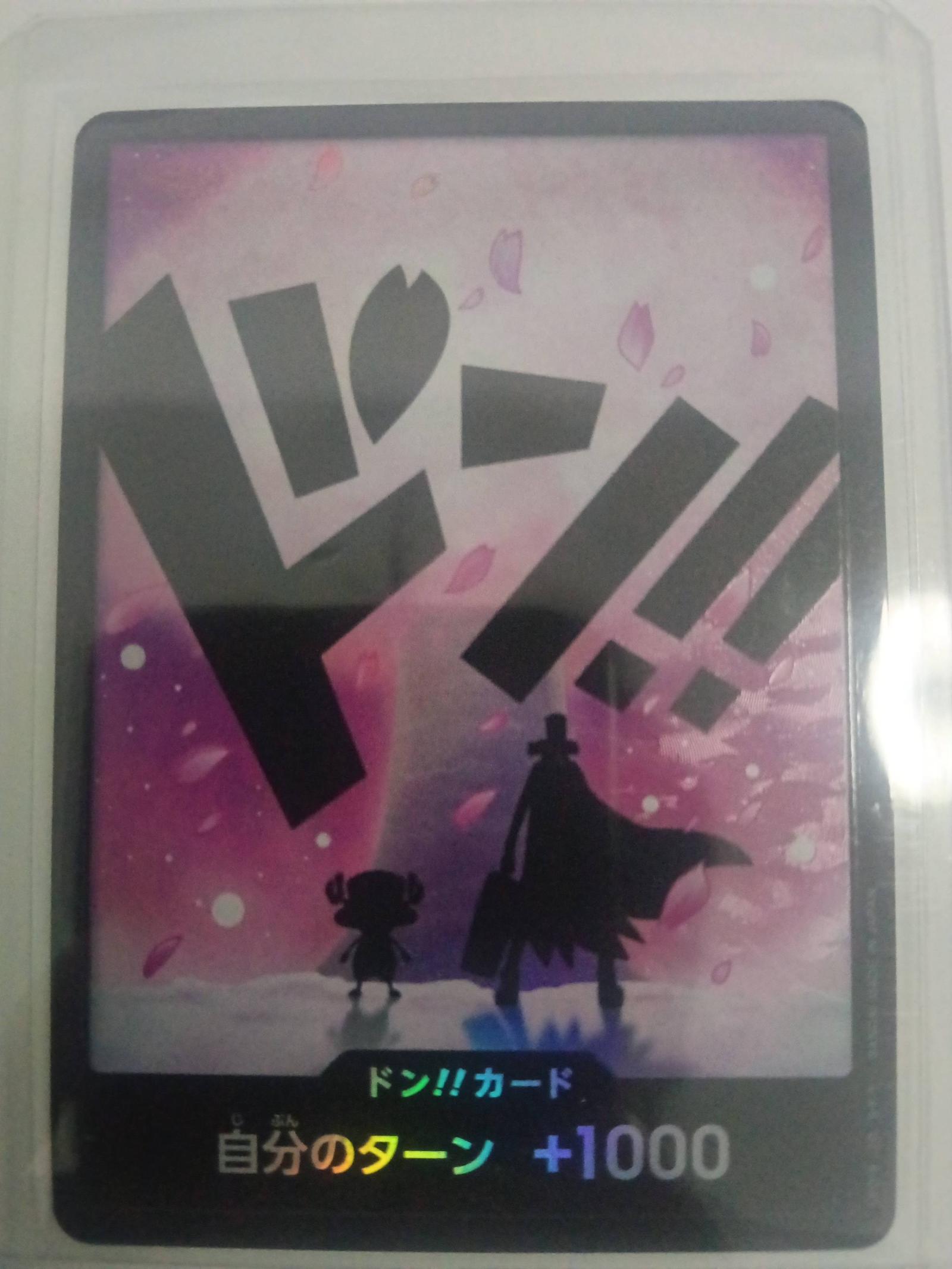 This is a One Piece Trading Card Game Don!! Card featuring a +1000 boost. The card has vibrant colors with silhouettes of characters and Japanese text. It is suitable for collectors and players focusing on the One Piece TCG. The card is protected in a plastic sleeve.