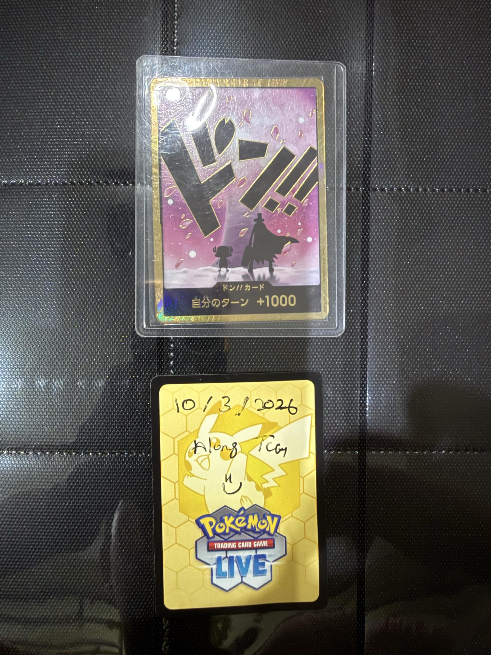 A rare One Piece Trading Card Game Don!! card featuring a +1000 boost for your turn. The card has vibrant artwork with characters silhouetted against a purple background with falling petals. Card is protected in a plastic sleeve. Back shows some writing related to Pokémon TCG Live but front is a genuine One Piece card.