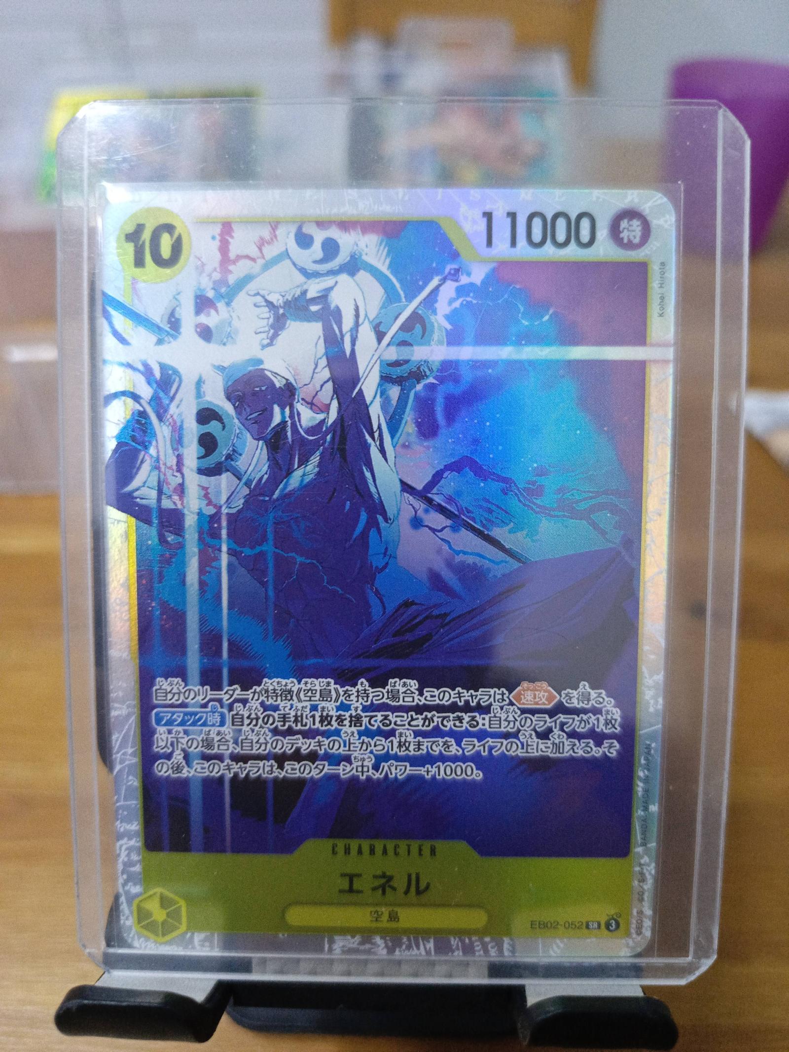 Japanese One Piece Trading Card Game (TCG) character card featuring Enel with 11000 power. Card number EB02-052. Holographic foil design with vibrant colors and clear text. Suitable for collectors and players. Protected in a hard plastic sleeve for preservation.