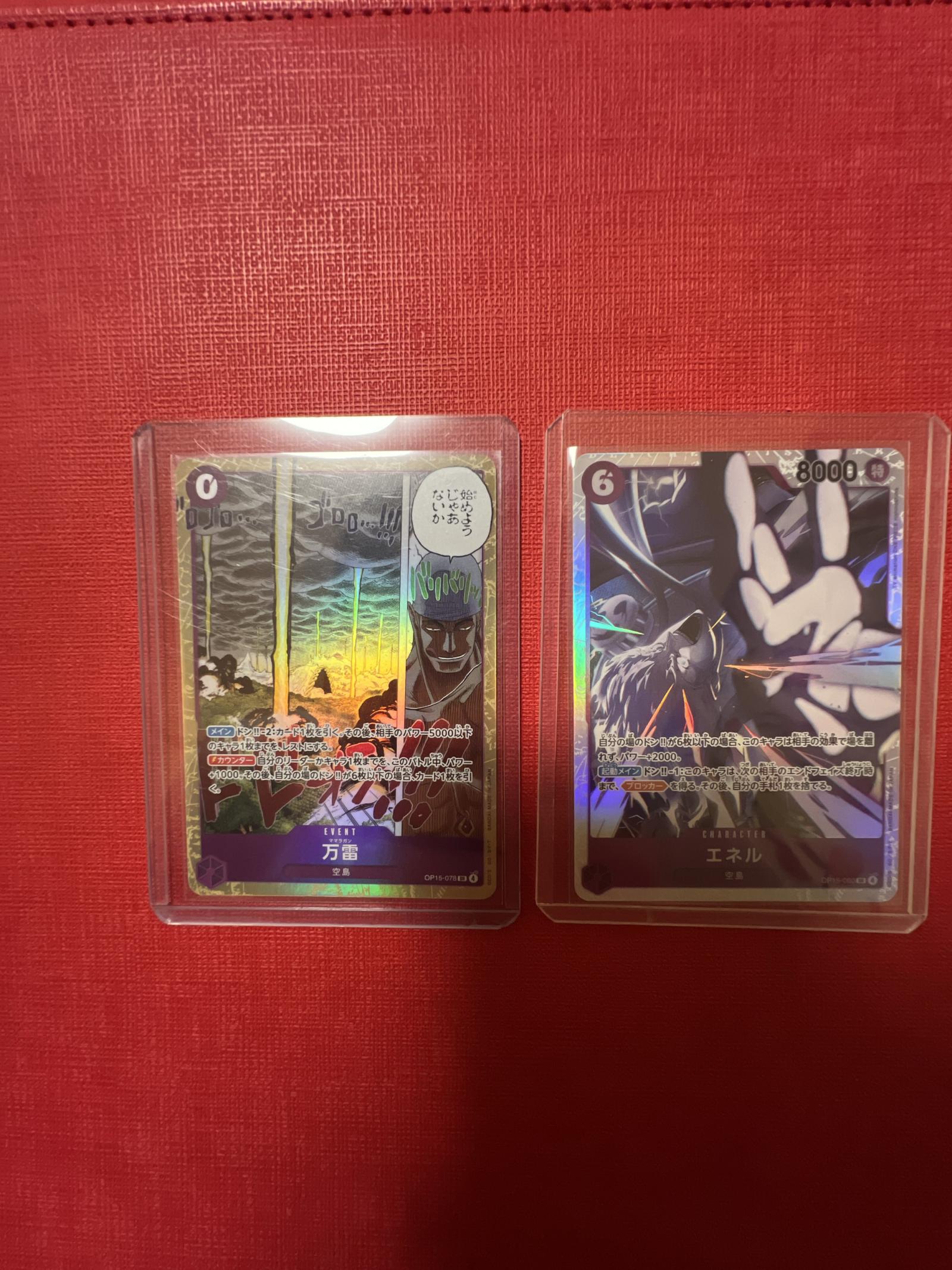 This listing features two rare holographic trading cards from the One Piece Trading Card Game. Included are the character card 'Enel' with 8000 power and a corresponding event card. Both cards are protected in sleeves. The cards showcase vibrant holographic effects and detailed artwork, suitable for collectors and competitive play.