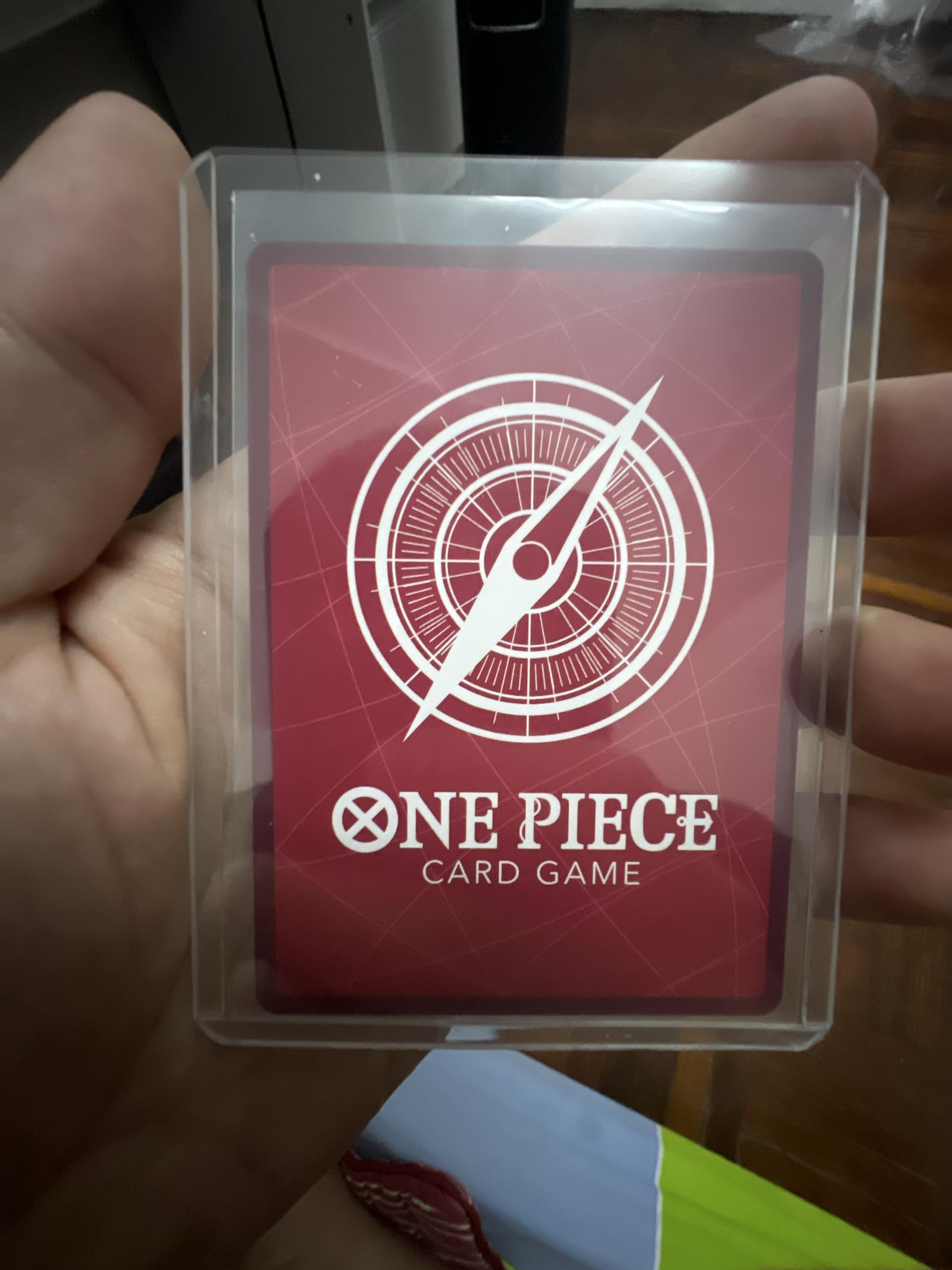This is a One Piece Trading Card Game leader card featuring Gol D. Roger, the King of the Pirates. The card displays vibrant holographic art and has a power value of 7000. It is kept in a protective sleeve, showing minor surface wear visible upon close inspection but no significant damage. Ideal for collectors and players alike.