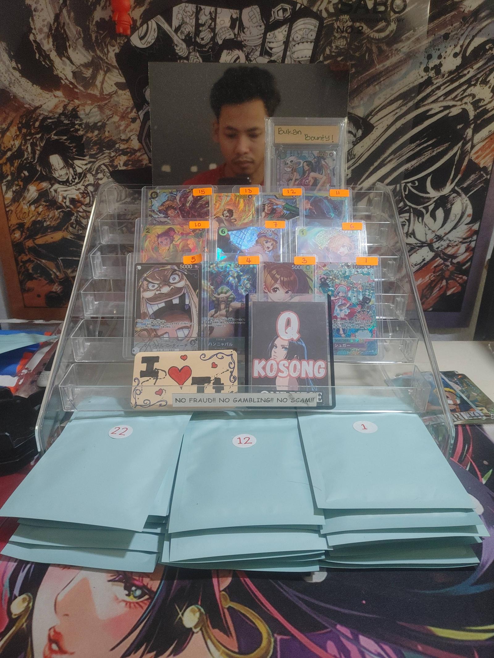 A diverse collection of One Piece Trading Card Game cards featuring multiple holo foil cards displayed on a clear acrylic stand. Includes cards with varied artwork and pricing labels, along with several unknown random packs sealed in numbered blue envelopes. Perfect for collectors and players looking to expand their One Piece TCG collection. Cards appear to be in excellent visual condition with no visible damage.