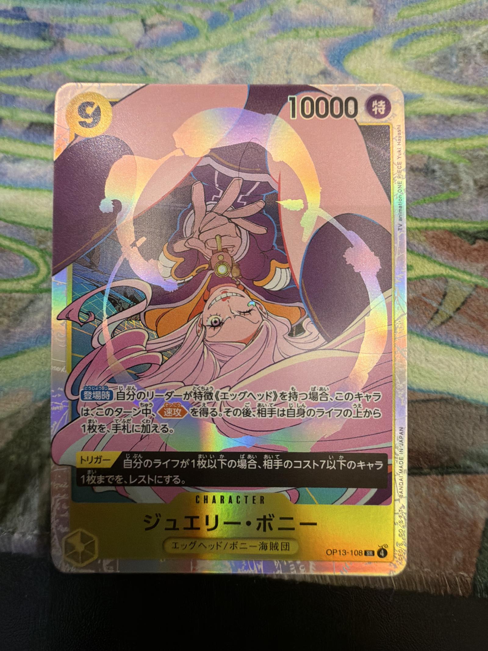 This is a One Piece Trading Card Game character card featuring Jewelry Bonney (ジュエリー・ボニー) from the Egghead/Ponies Pirates faction. The card number is OP13-108. It is a holographic foil card with Japanese text and artwork showing Jewelry Bonney playing a trumpet. The card has minor surface wear visible, but no major creases or damage.