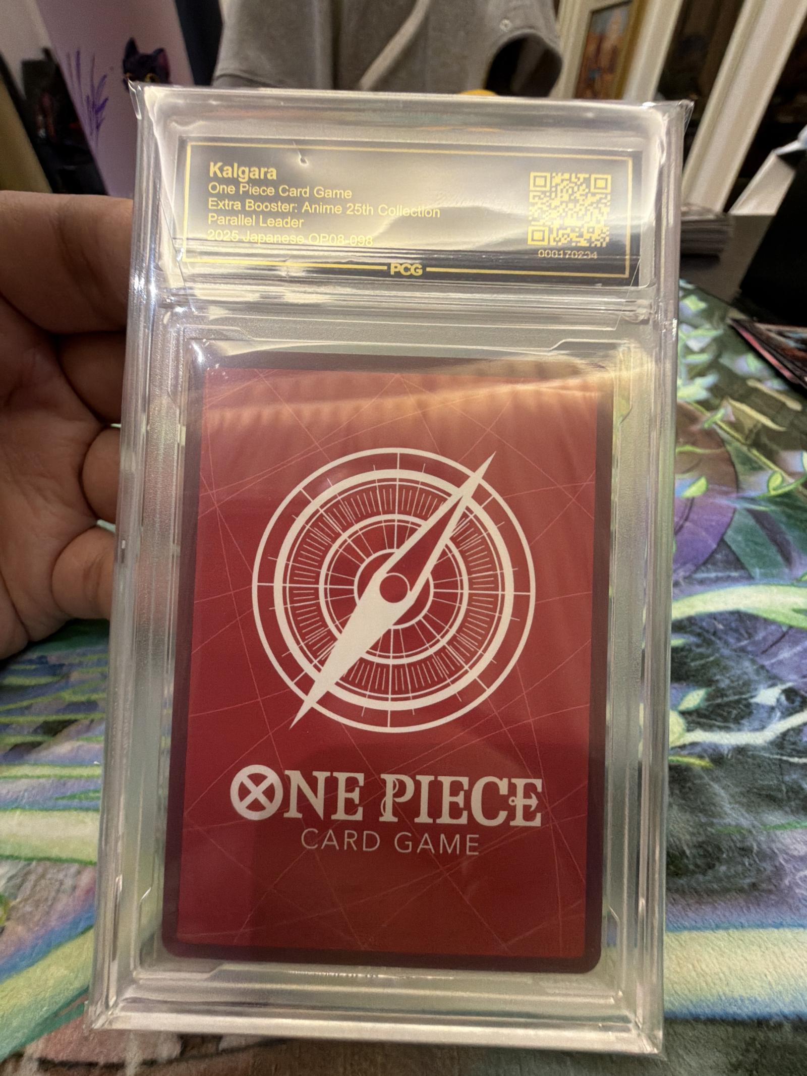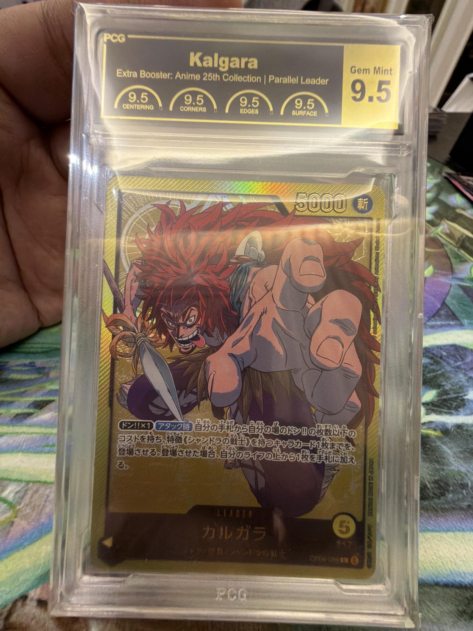 A PCG gem mint graded One Piece trading card featuring Kalgara from the Extra Booster: Anime 25th Collection. This parallel leader card has received outstanding grades of 9.5 in centering, corners, edges, and surface quality, encapsulated professionally for top condition preservation. A rare and highly collectible piece for fans and serious collectors of the One Piece Card Game.