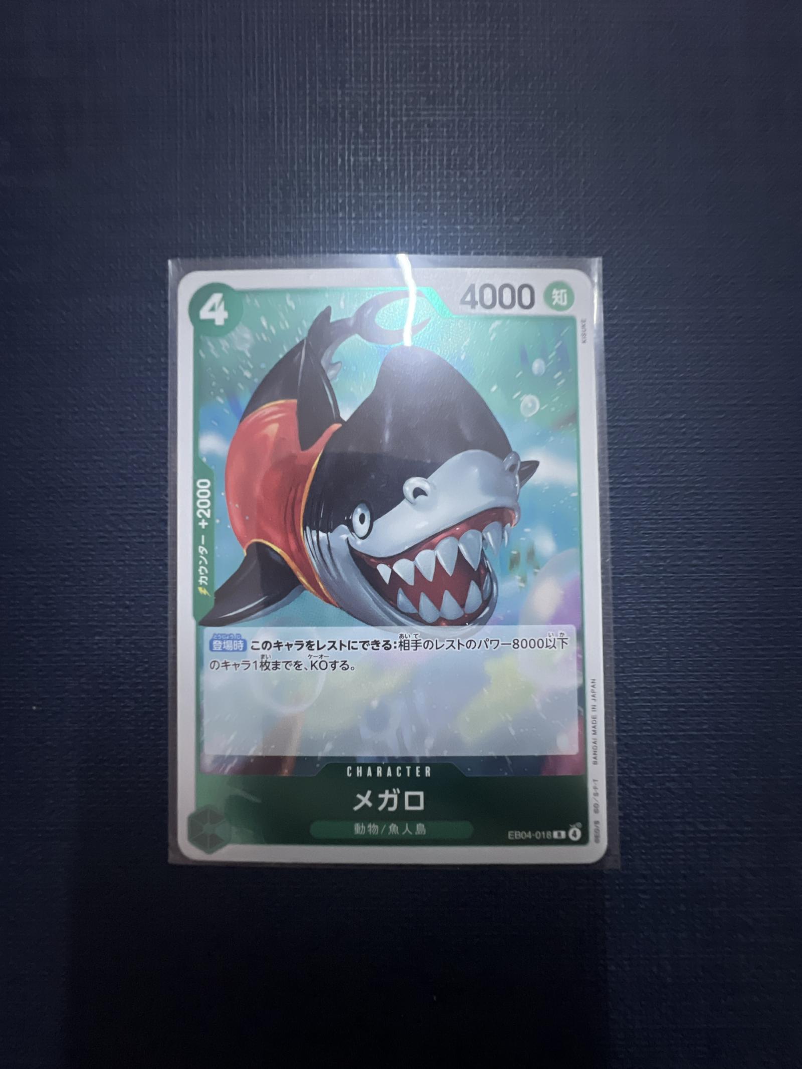 This is a One Piece Trading Card Game character card featuring Megalo, a shark humanoid. The card is in a protective sleeve and shows no visible signs of damage or wear. The card text and stats are in Japanese. A great addition for collectors of One Piece TCG cards.