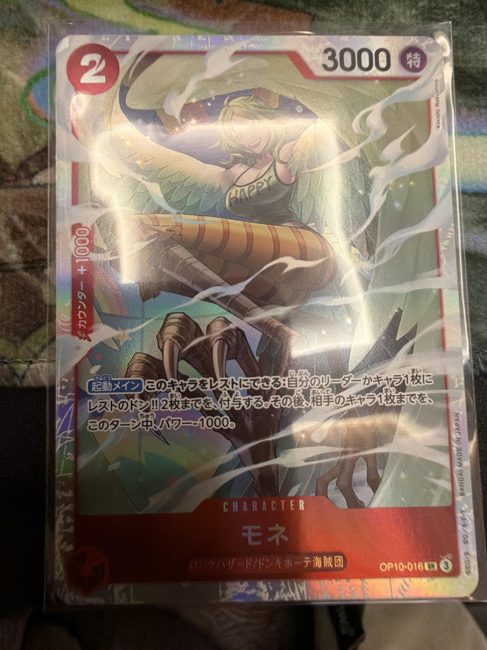 This One Piece Trading Card Game character card features Monet from the Hazard Paper Pirate Crew. The card has a power of 3000 and a cost of 2. Includes Japanese text and a holographic finish. The card appears to have some surface wear and edge wear visible in the photos.