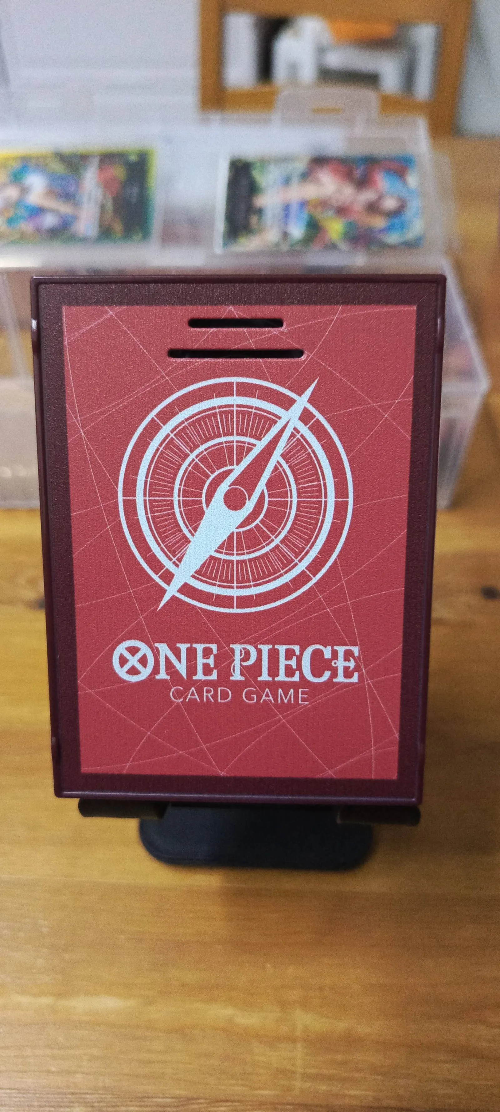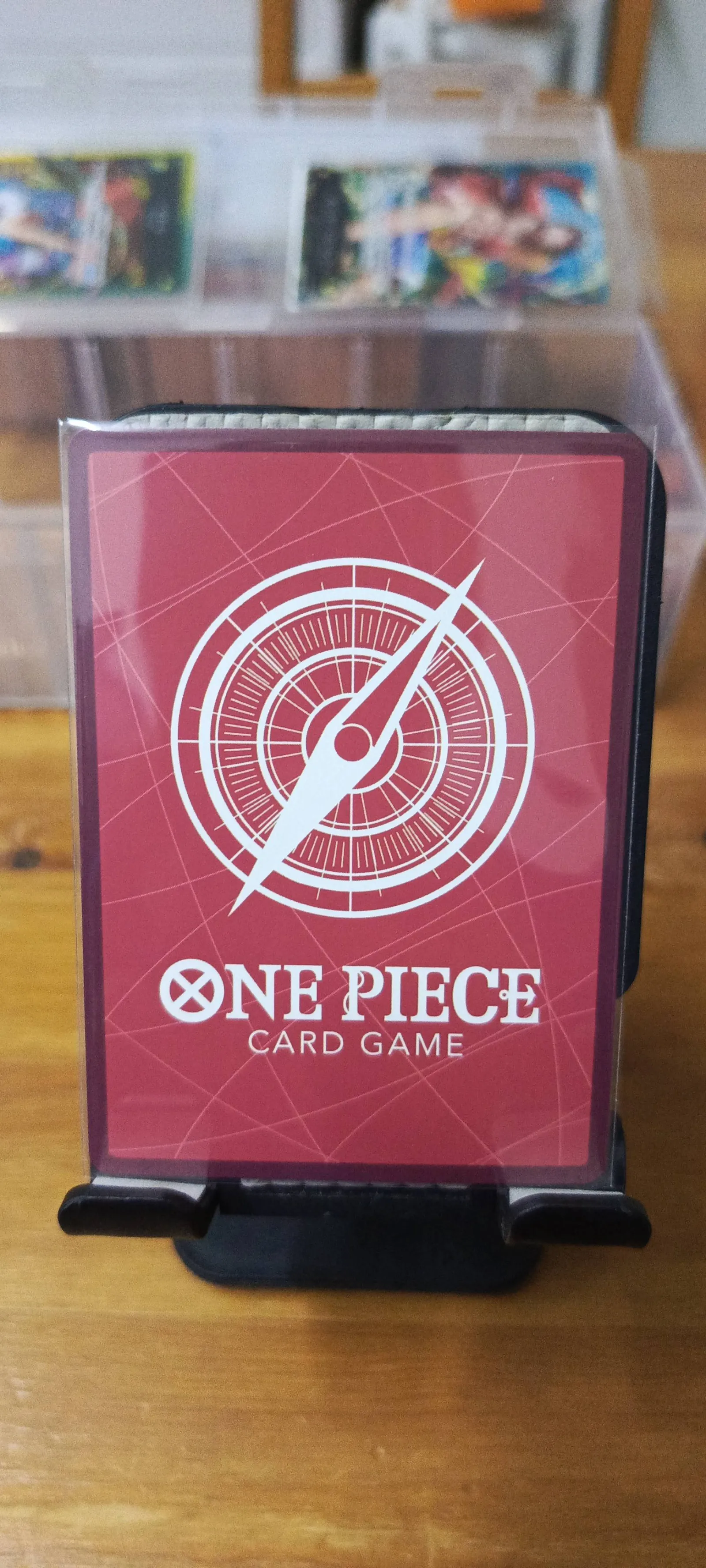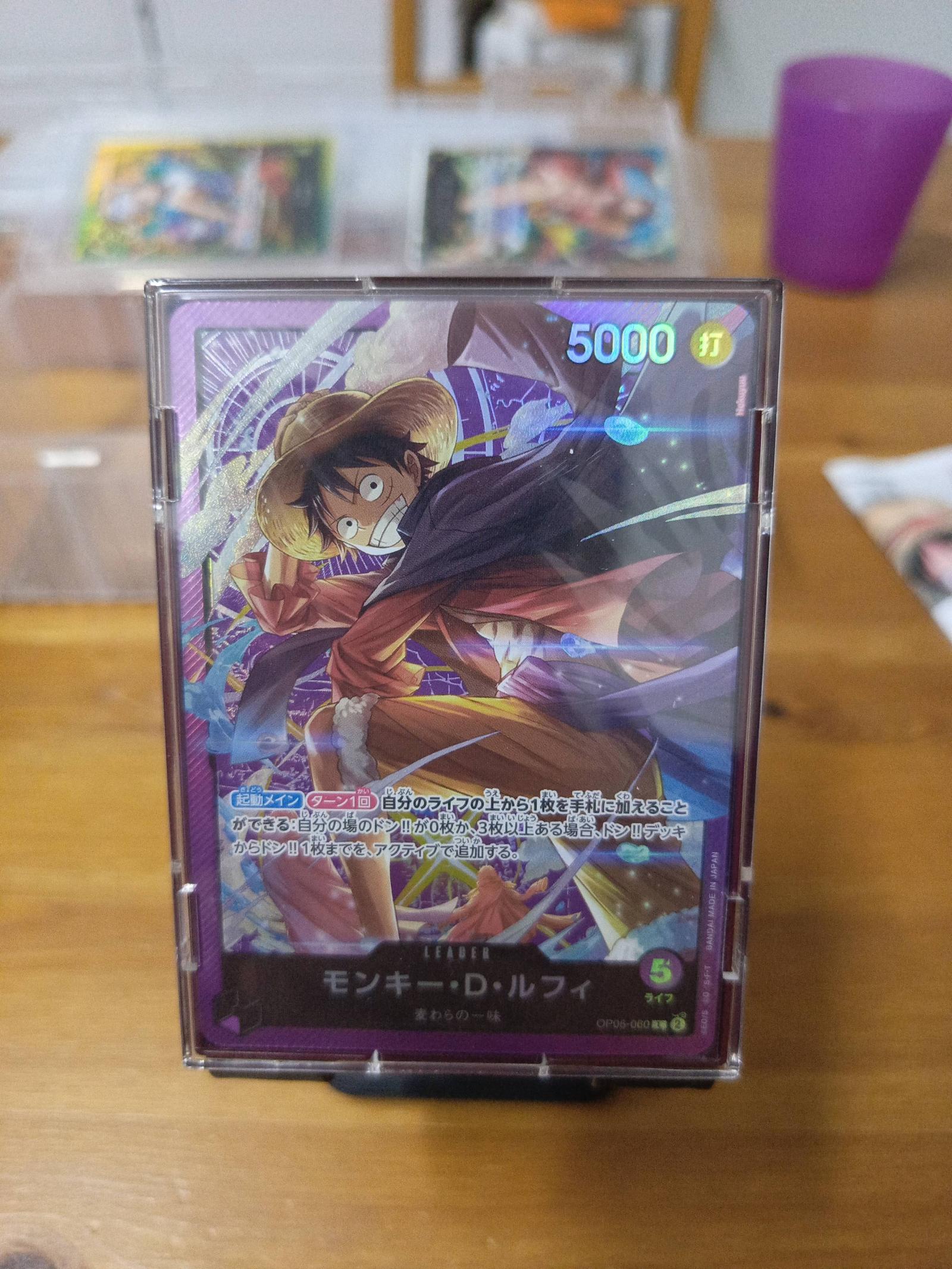 A Japanese One Piece Trading Card Game (TCG) featuring Monkey D. Luffy as the leader character. This card is a rare holofoil with dynamic artwork depicting Luffy in action. The card is protected in a hard plastic case, showing no visible wear or damage. Perfect addition for collectors and players of the One Piece TCG.