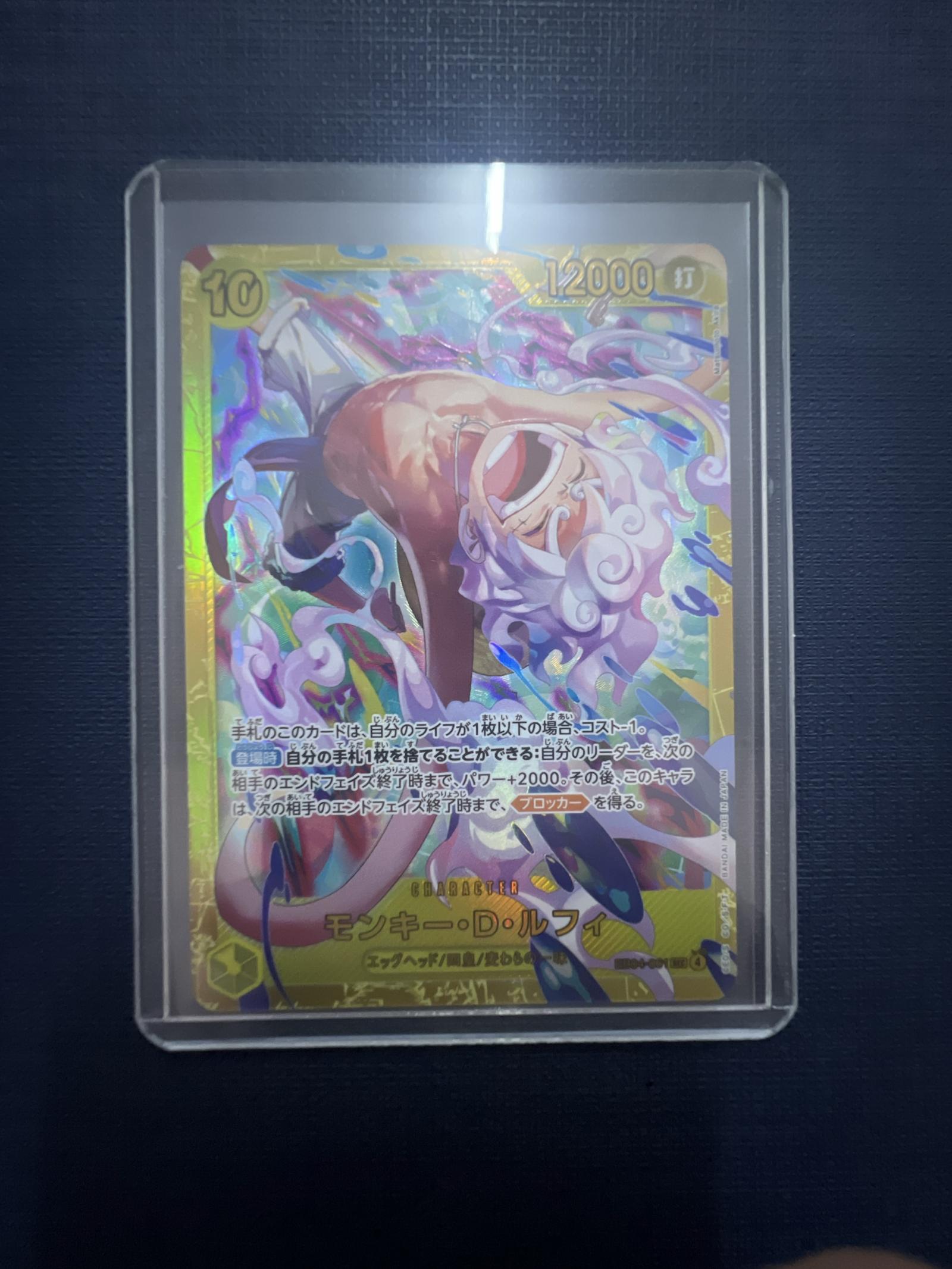 A highly collectible Monkey D. Luffy card from the One Piece Trading Card Game featuring a vibrant gold foil design and powerful stats. The card is protected in a plastic sleeve, showcasing excellent artwork and holographic effects. Perfect for collectors or players looking to enhance their deck with a visually stunning and rare character card.