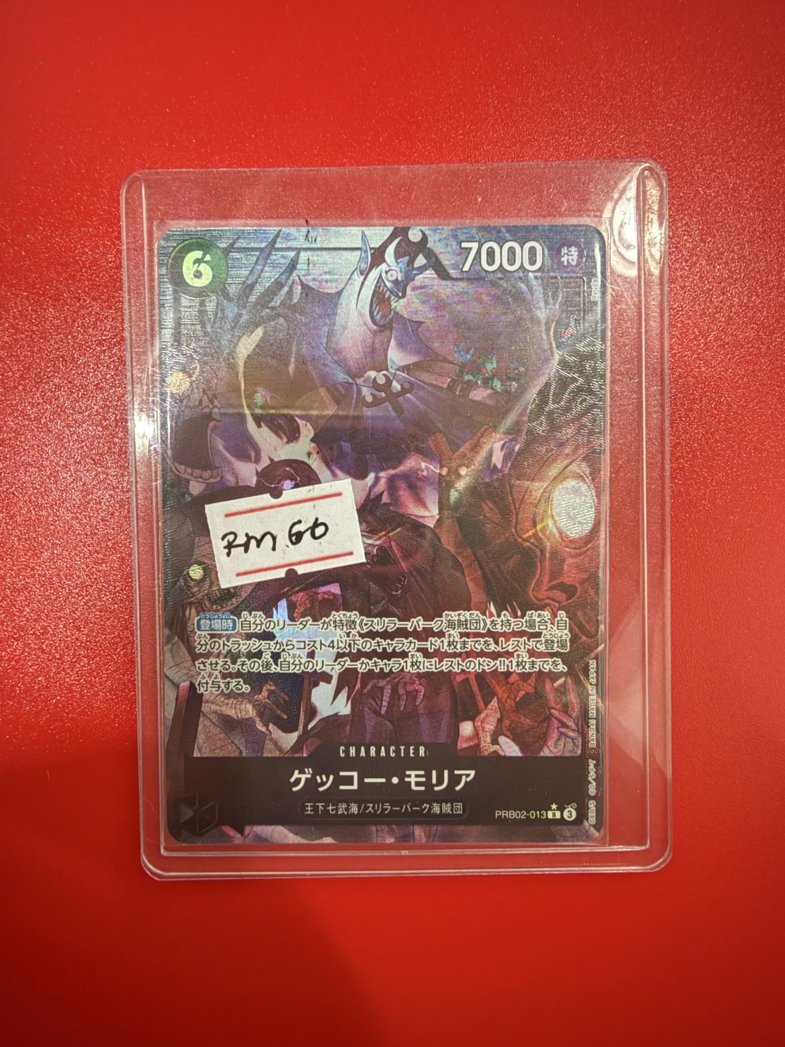 Notable features: This is the holographic (AA) version of Gecko Moria from the PBR02 set — official card number PBR02-013. The card artwork is full-color holo with a textured foil effect across the face. Card displays a handwritten price sticker on the sleeve (RM60) but the sticker is on the sleeve, not the card surface.
