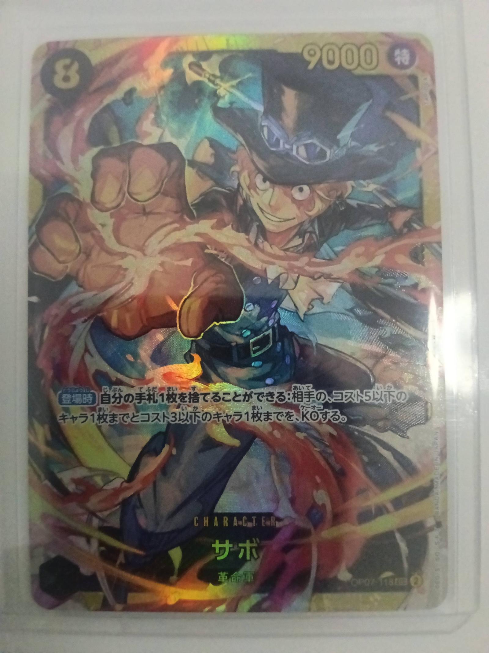 This is a rare holographic One Piece Trading Card Games character card featuring Sabo. The card shows vibrant artwork with Sabo in dynamic pose surrounded by flames. Text on the card is in Japanese, including game stats and abilities. The card is kept in a protective sleeve for preservation.