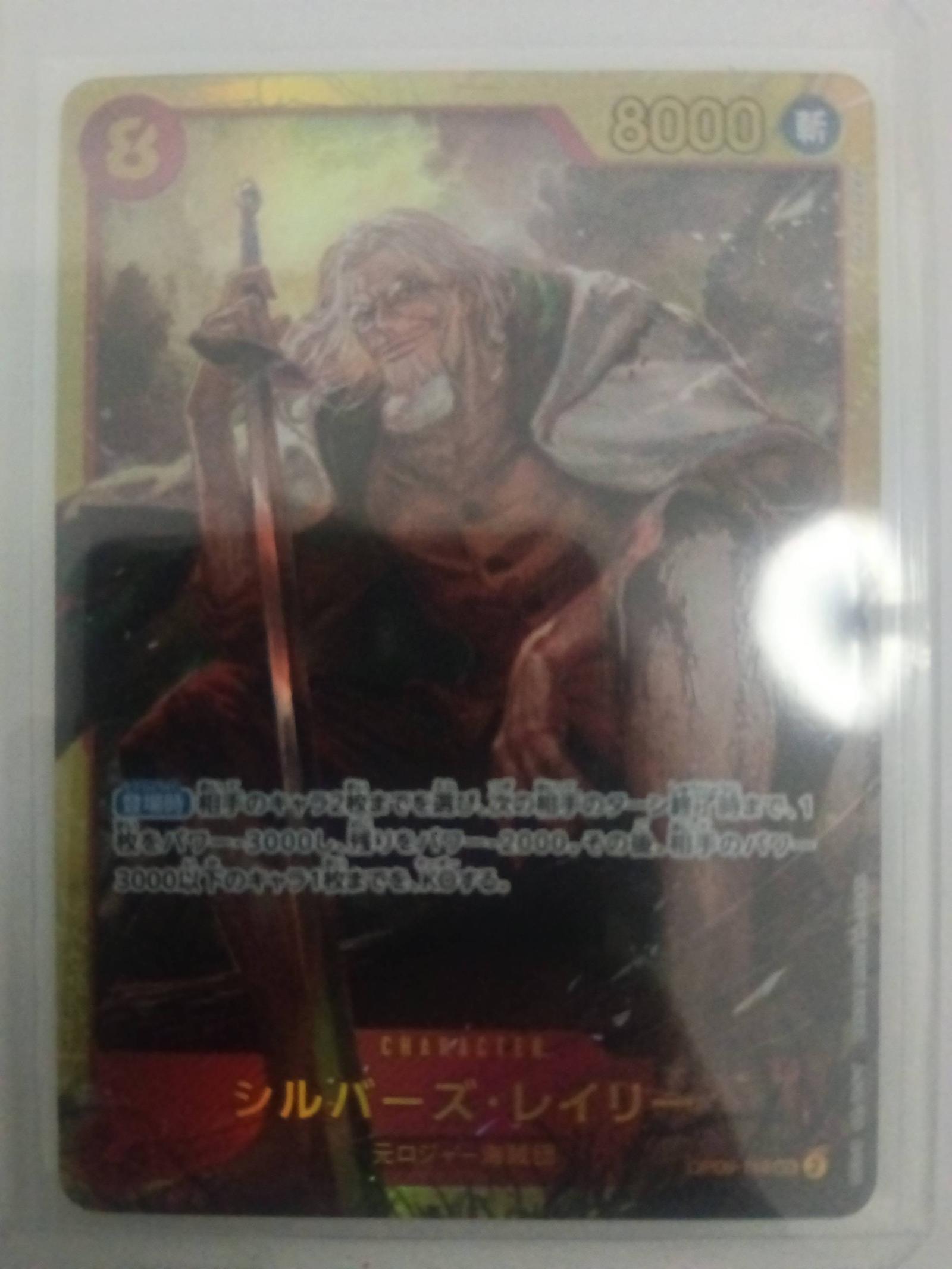 A One Piece Trading Card Game character card featuring Silver Rayleigh with 8000 power. The card is in protective sleeve and shows some wear visible in the photo.