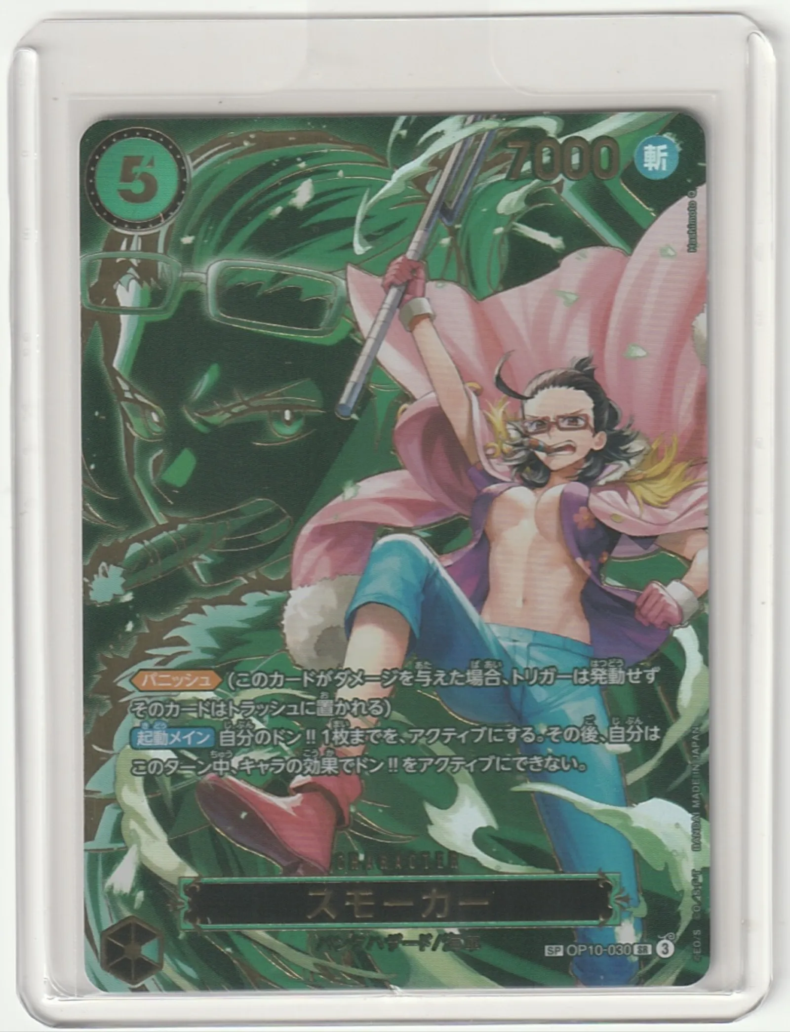 Japanese One Piece Trading Card Game character card featuring Smoker with a damage value of 7000. The card is housed in a protective sleeve and shows clear artwork of Smoker in a dynamic pose. Text is in Japanese, with special abilities and stats displayed. Suitable for collectors and players.