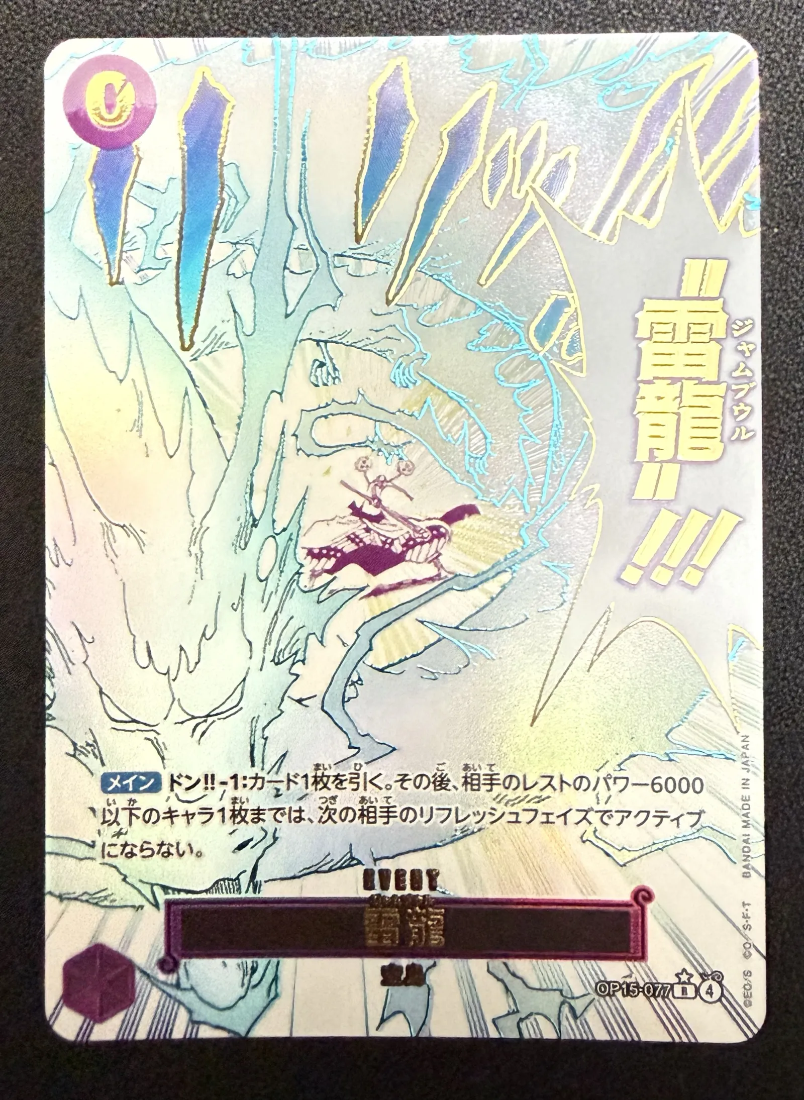 A rare holographic One Piece trading card featuring 雷龍 (Thunder Dragon) with unique foil effects. The card is protected in a plastic sleeve to maintain its condition. Text and artwork are intact with visible foil shine.