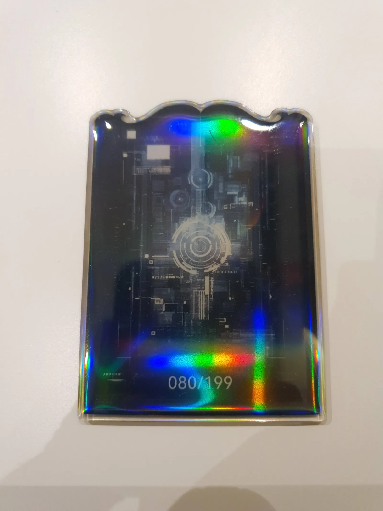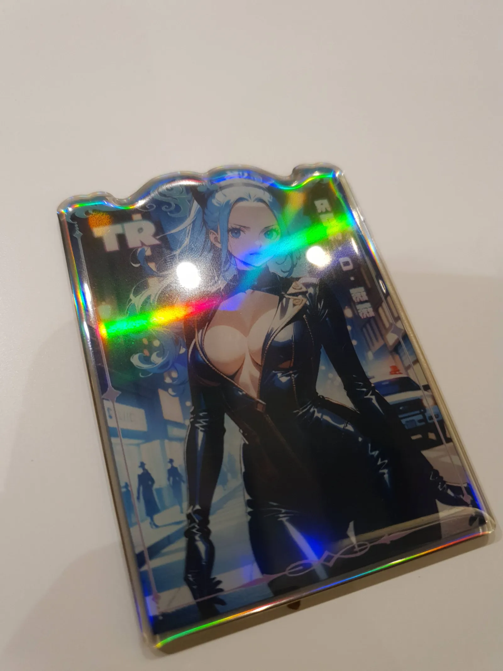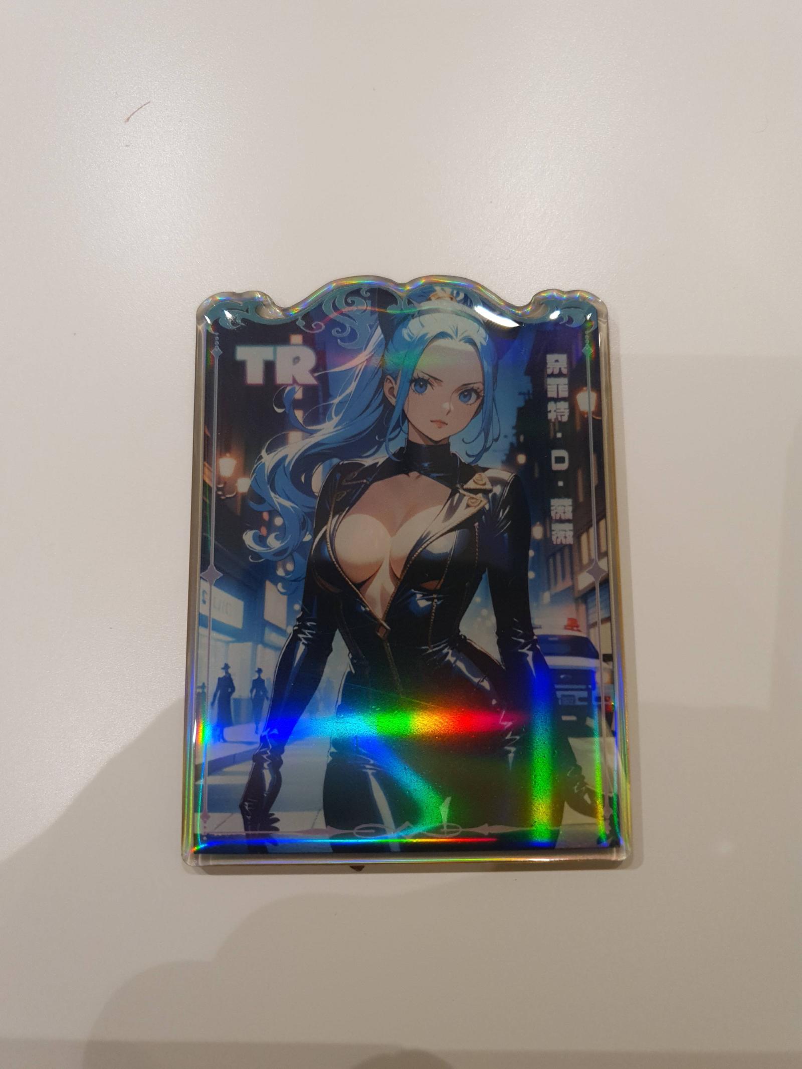 A shiny holographic trading card from the One Piece series, featuring Nefertari Vivi with blue hair in a black outfit. The card has a unique top-cut shape and vibrant foil effects. It is suitable for collectors of rare or visually striking One Piece TCG cards. Serial number 080/199