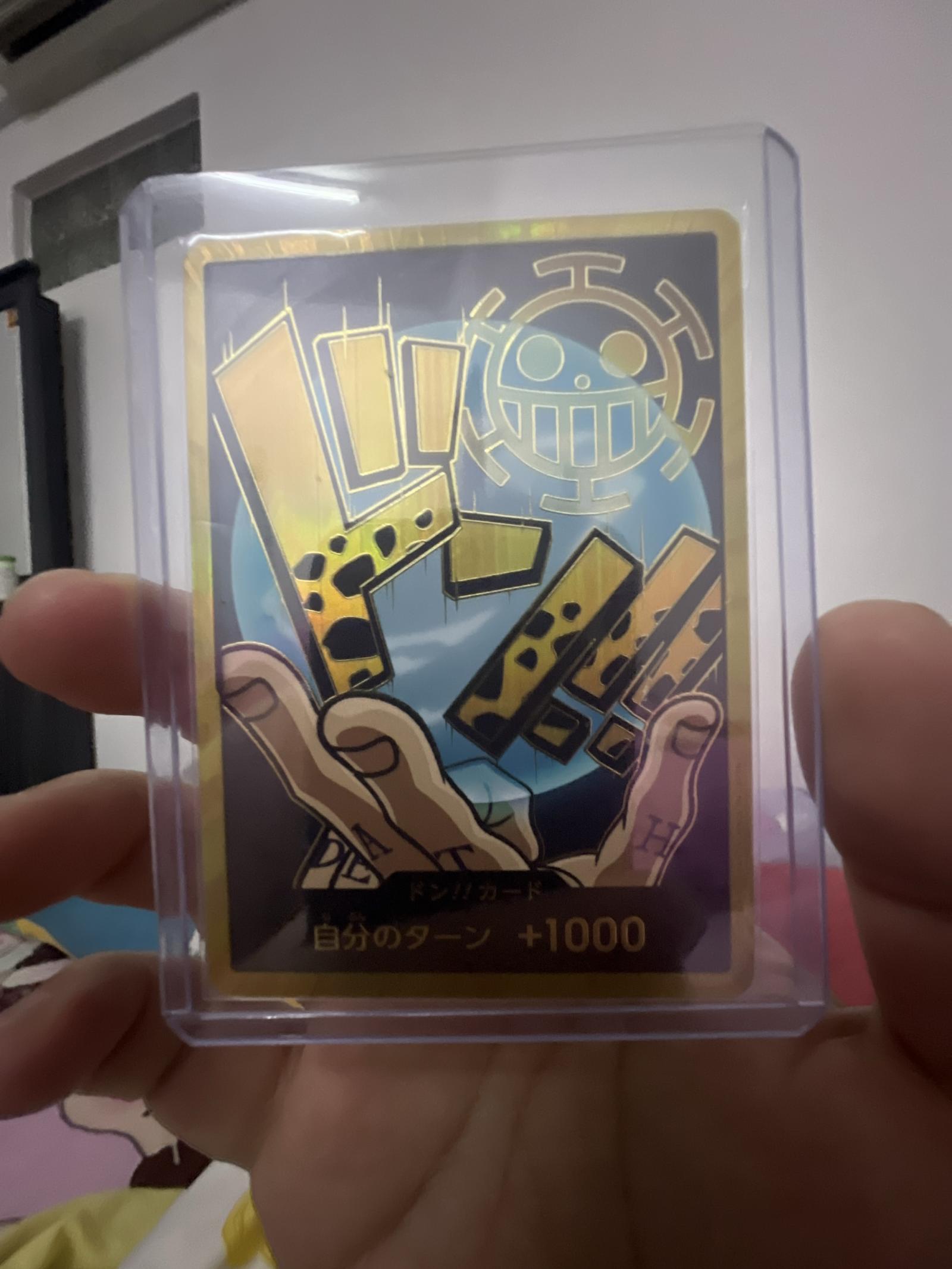A One Piece trading card featuring the Don!! card with a power boost of +1000 for your turn. The card is encased in a protective sleeve, showcasing its gold-bordered design and vibrant artwork. Perfect for collectors and players of the One Piece TCG.