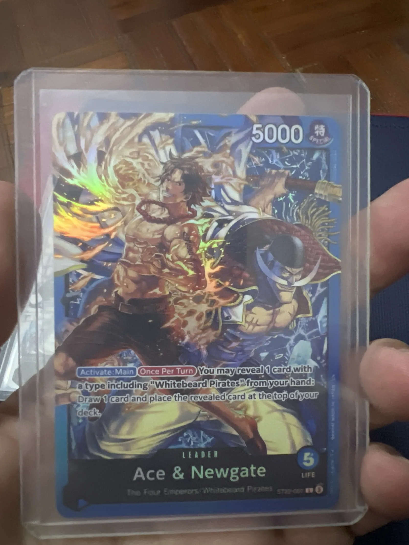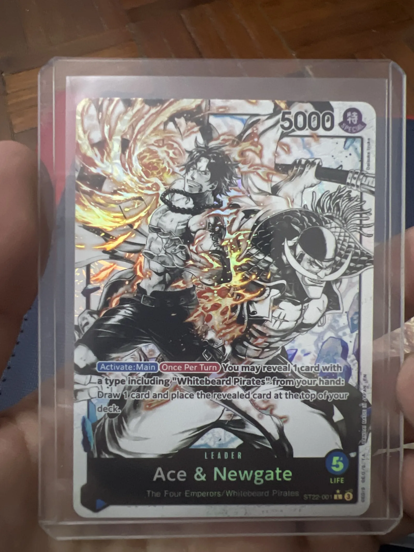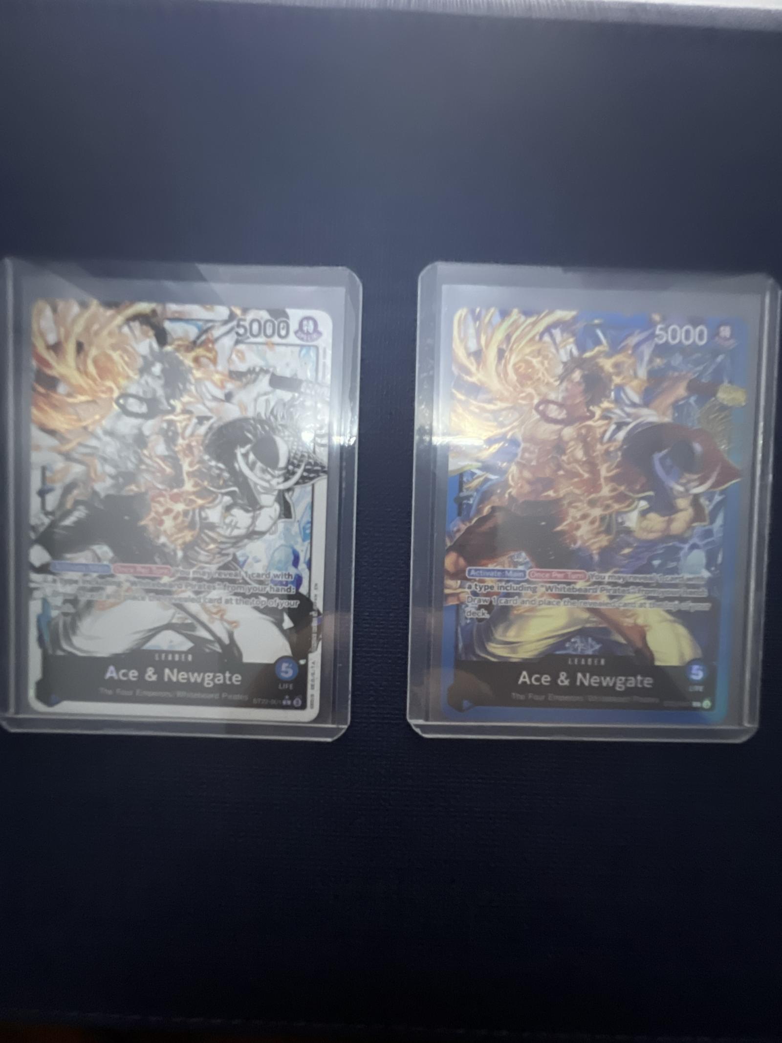 This set includes two Ace & Newgate promo cards from the One Piece Trading Card Game. Both cards feature vibrant artwork of the characters with a power value of 5000. Cards are stored in protective sleeves and appear to have minimal wear. Great addition for collectors or players.