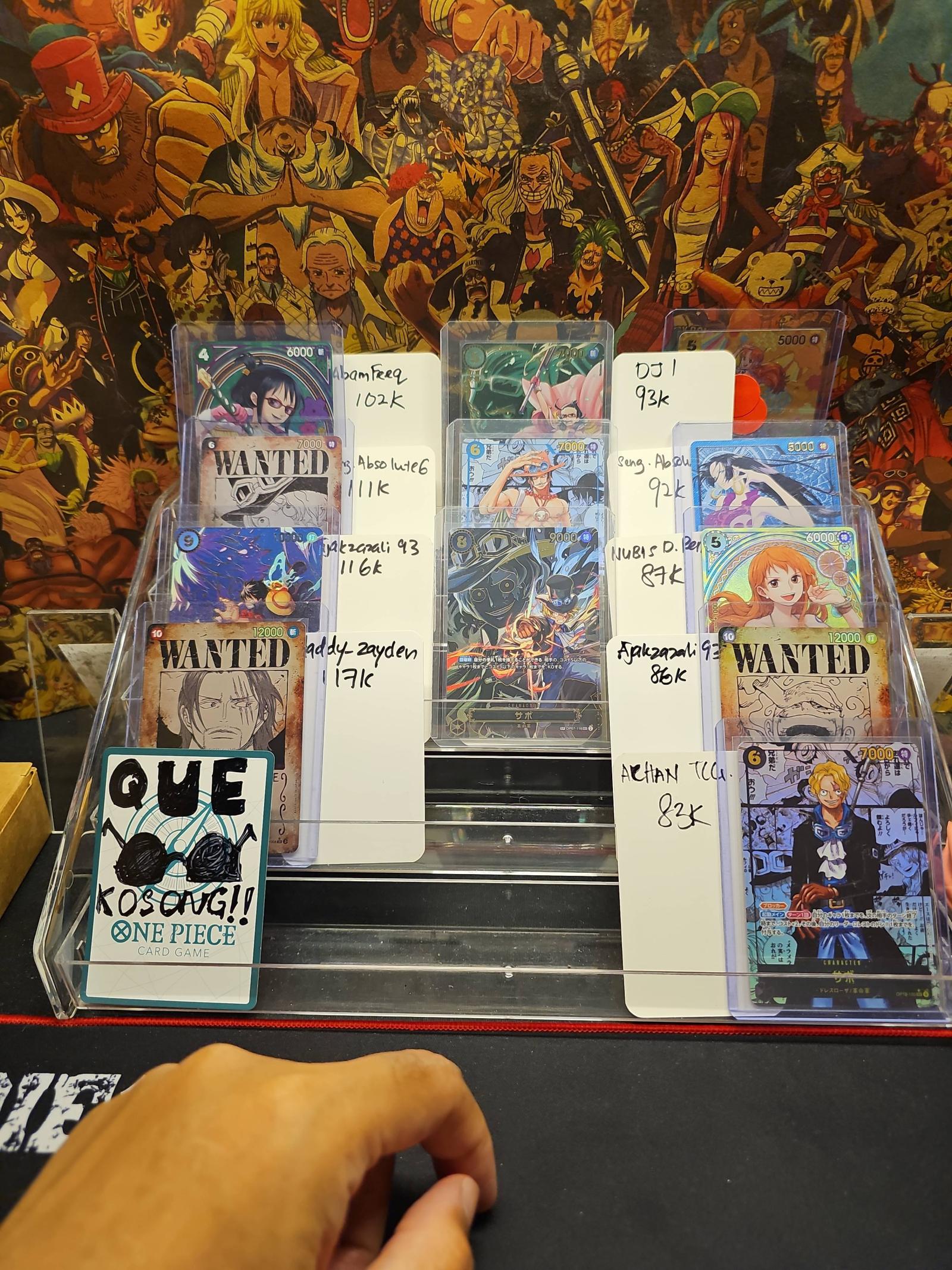 A curated set of One Piece Trading Card Game cards including popular character and Wanted poster cards. Cards are displayed in protective sleeves and organized in sets with price tags visible. The collection features iconic One Piece characters such as Sanji, Nami, and others, perfect for collectors and players of the One Piece TCG.