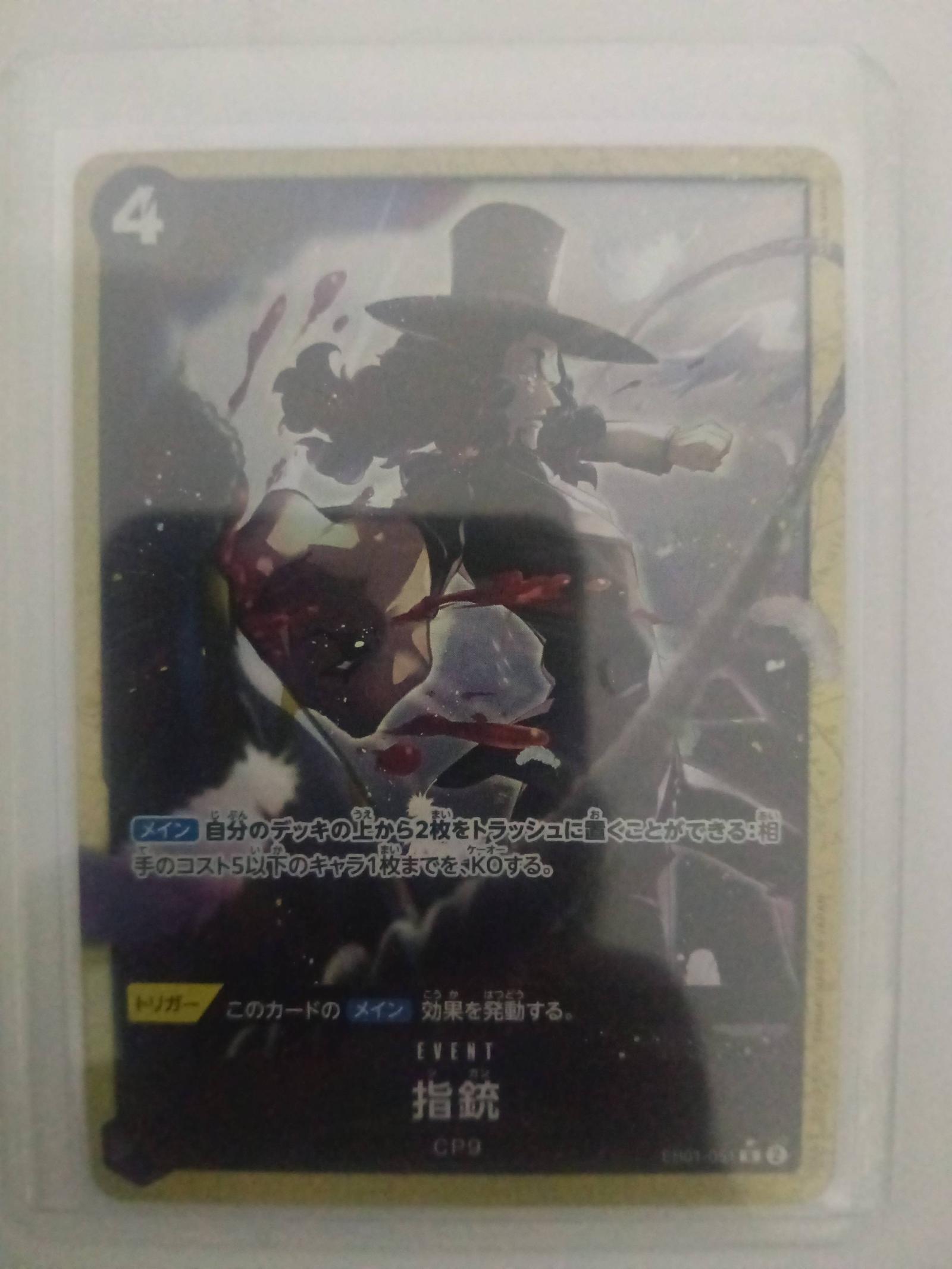 This One Piece TCG card features the character Rob Lucci from CP9 in an event titled '指銃'. The card has Japanese text, with a cost of 4, and depicts Rob Lucci aiming a gun with a dark, intense background. The card appears to be in a protective sleeve.
