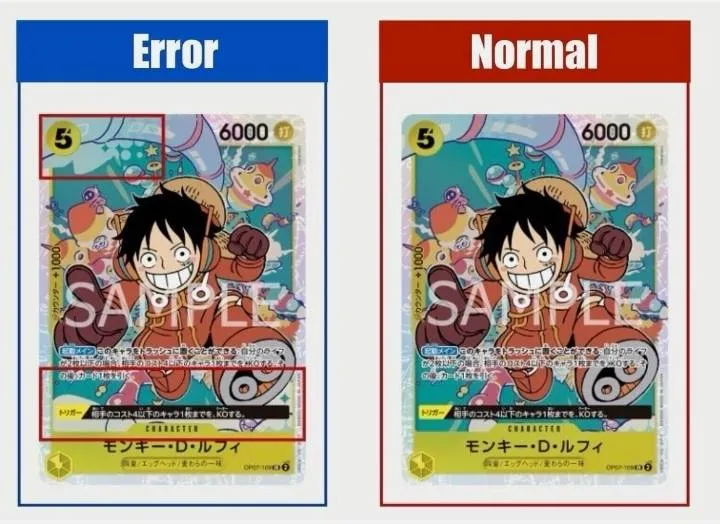 Rare Luffy ERROR CARD from the One Piece Trading Card Game, set OP07-109. Featuring vibrant artwork and holofoil shine. Text and abilities are in Japanese. A great addition to any One Piece TCG collection or for gameplay.