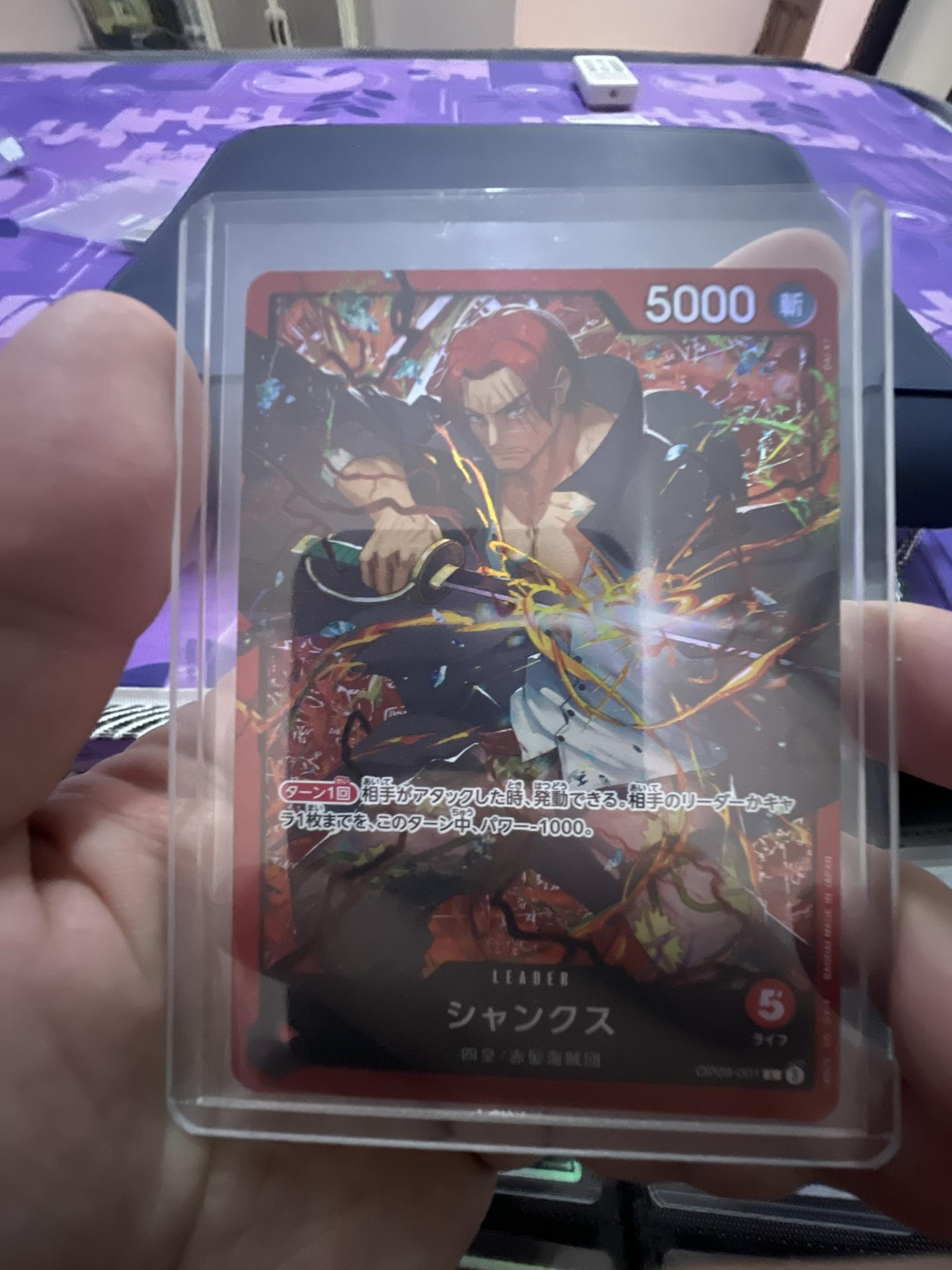 This is a One Piece Trading Card Game card featuring Shanks as the Leader character. The card text and stats are visible, with a power level of 5000. It is protected in a clear plastic sleeve, showing minimal wear. The card is vibrant with multicolored effects and detailed artwork of Shanks drawing his sword.