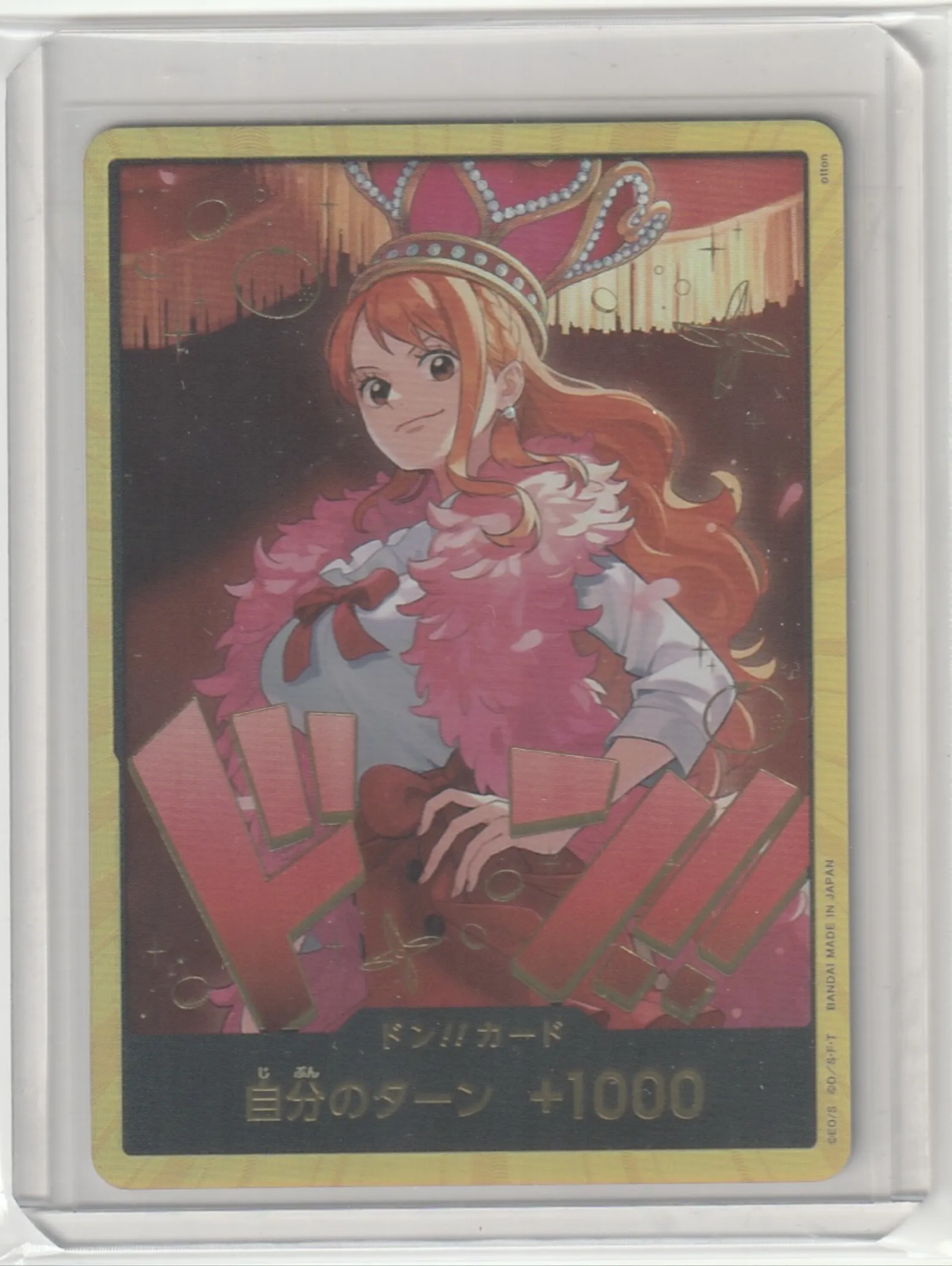 A One Piece trading card featuring Nami with a Don!! boost effect giving +1000 to your turn. The card is protected in a plastic sleeve and appears to be in excellent condition with no visible creases or damage.