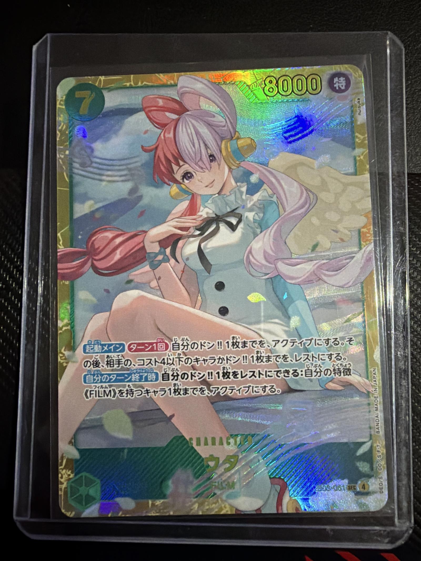This is a rare holographic One Piece trading card featuring Uta in a detailed, vibrant design with Japanese text. The card has a 7 cost and 8000 power rating. It is stored in a protective sleeve. The card is suitable for collectors and fans of the One Piece Trading Card Game.