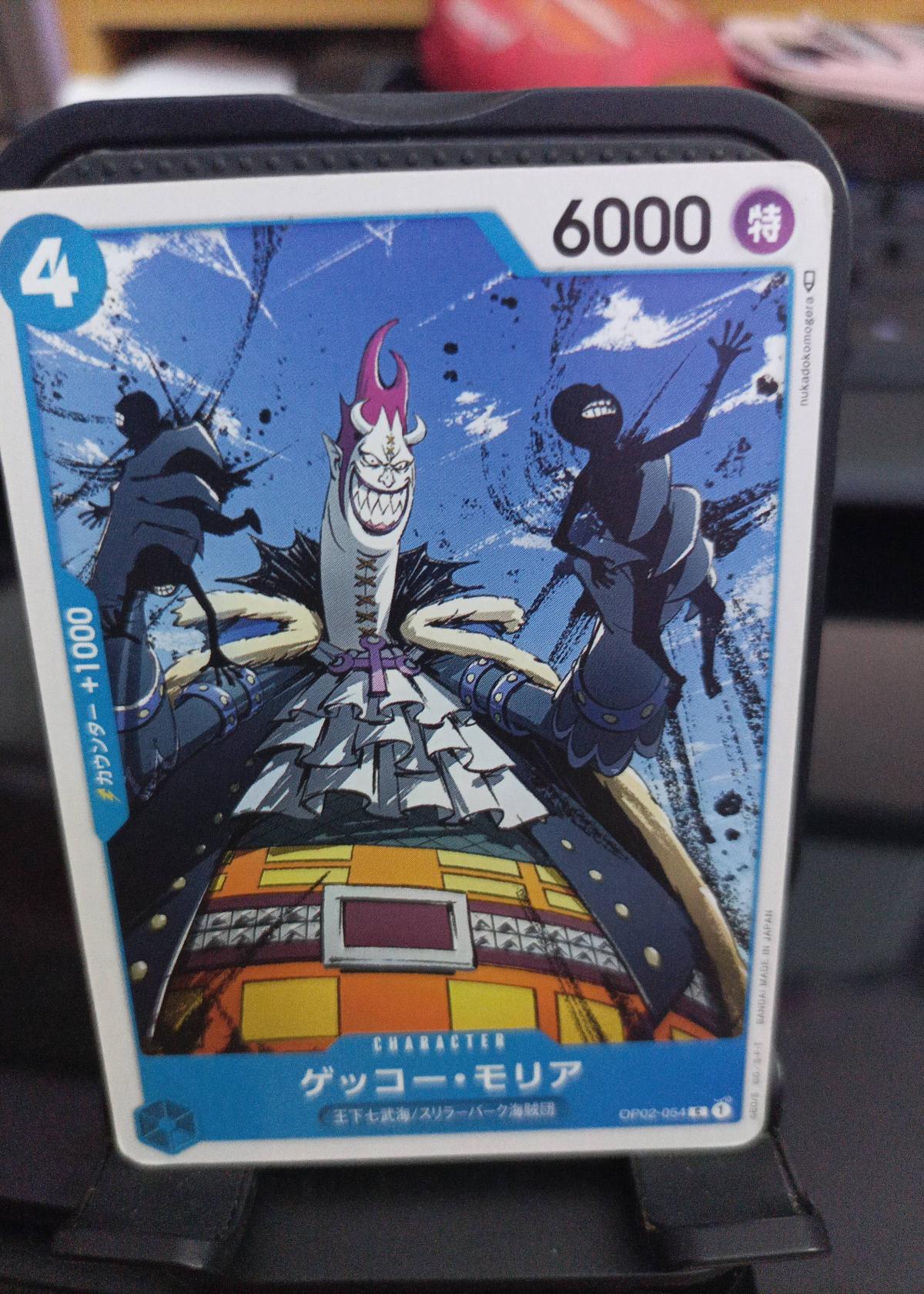 This is a Gecko Moria character card from the One Piece Card Game. Featuring artwork of Gecko Moria with a power of 6000 and a cost of 4, this card is part of the OP02 set. It is a Japanese edition and is suitable for fans and collectors of the One Piece TCG.