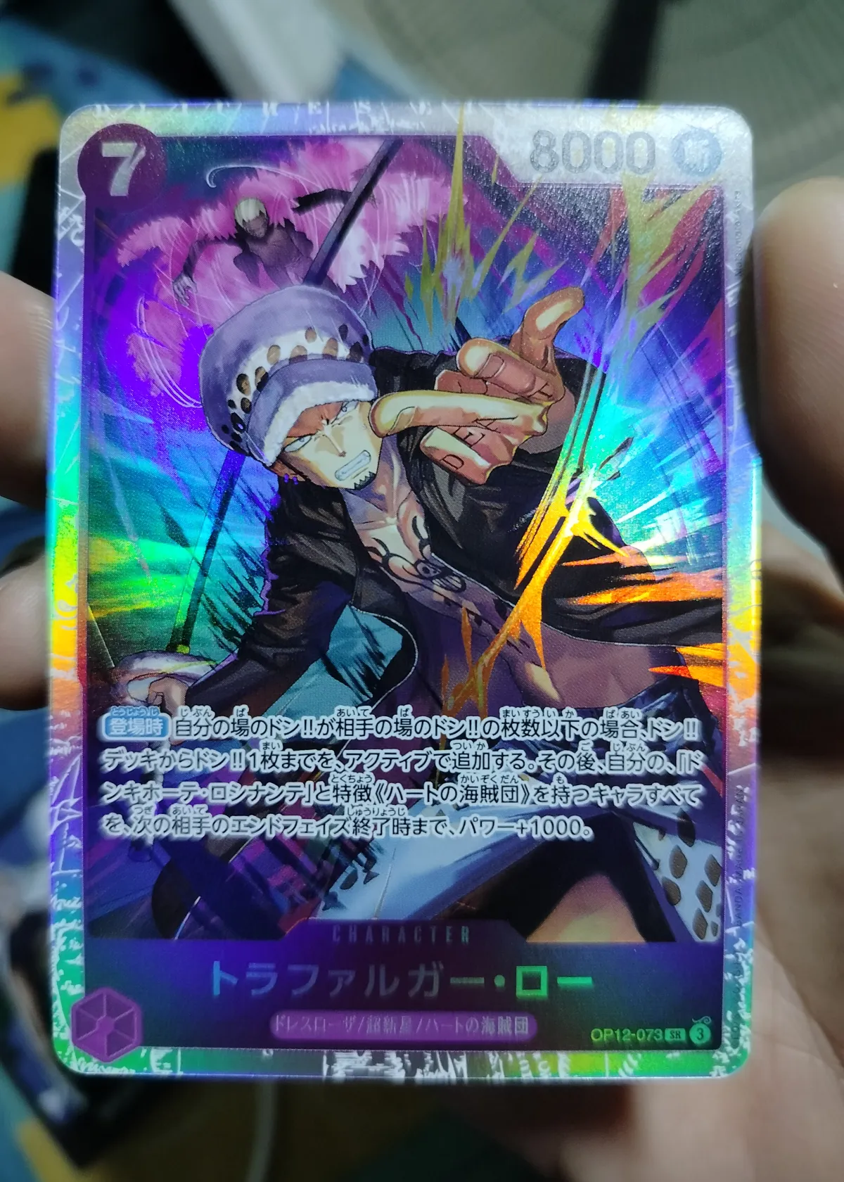 This image depicts a Trafalgar Law character card from the One Piece Trading Card Game. Law is a prominent character in the One Piece manga and anime series. Here are some key details about Trafalgar Law: Title: Known as the "Surgeon of Death", he is a skilled doctor and pirate. Devil Fruit: He possesses the power of the Ope Ope no Mi, which allows him to create a spatial area where he can manipulate objects and people. Crew: Captain of the Heart Pirates. Alliances: He has formed alliances with the Straw Hat Pirates at various points in the series. Dream: Law seeks to understand the meaning of the "D." in his name and the true history of the world. The card itself has a cost of 7 and an attack power of 8000. It also has a special ability that allows the player to add a DON!! card from their deck and increase the power of certain characters.