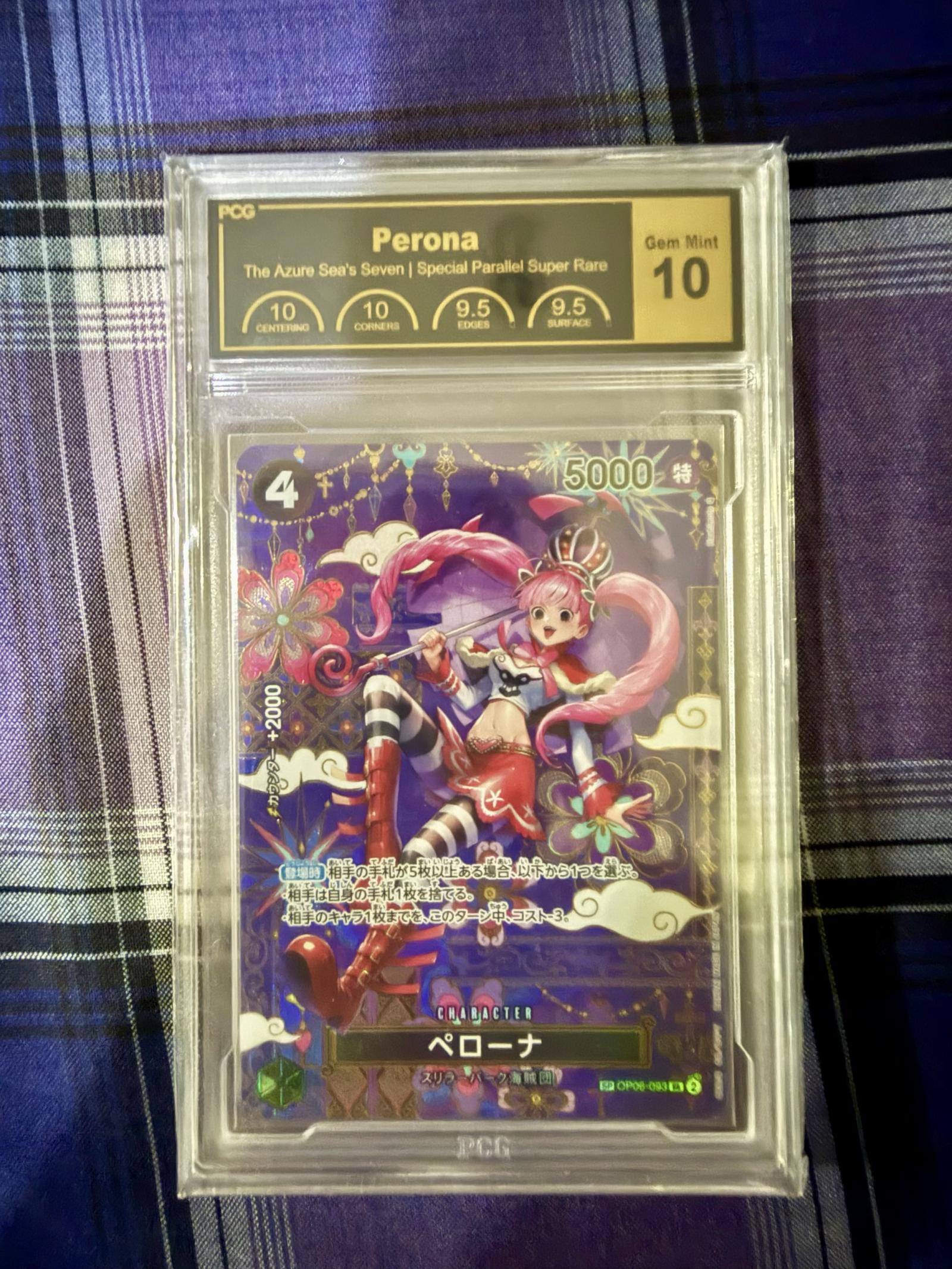 Perona from the One Piece Card Game, set 'The Azure Sea's Seven.' This is a Special Parallel Super Rare card, numbered OP06-093, Japanese language. Graded Gem Mint 10 by PCG. Highly collectible and sealed in a protective case.