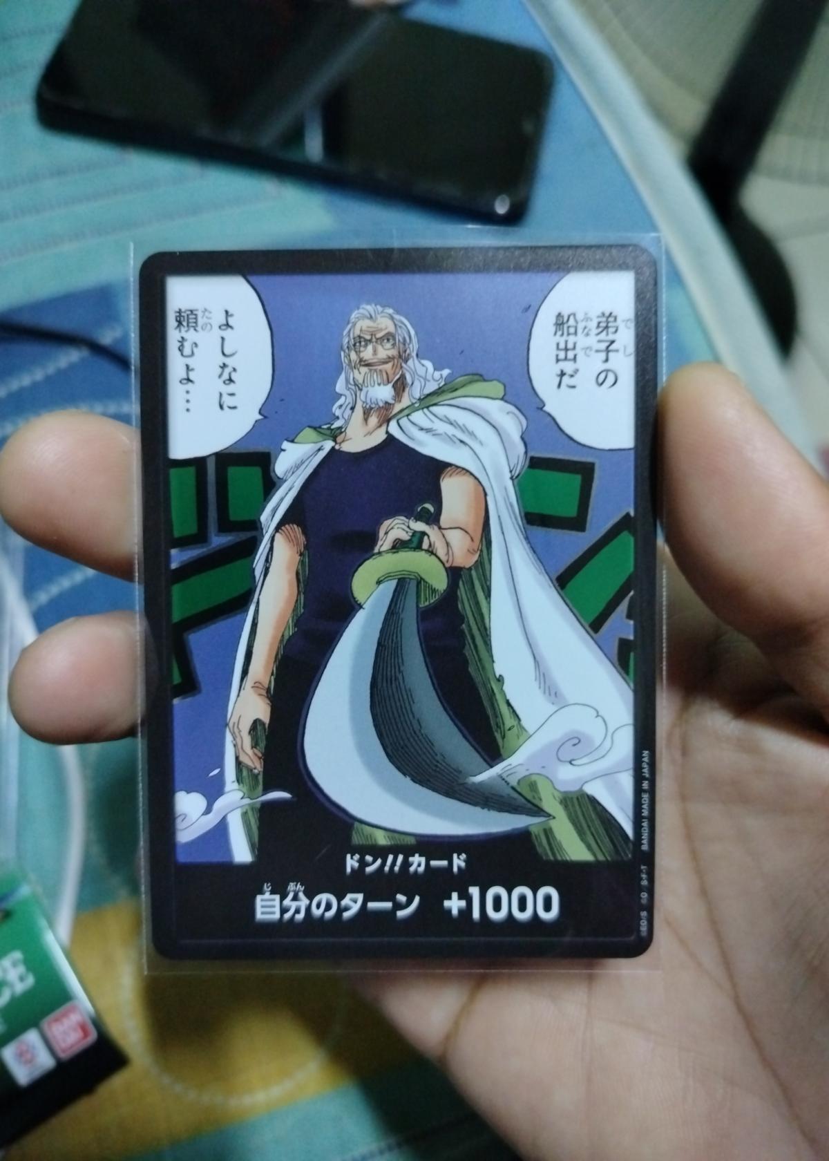 The Don!! card provides +1000 power during your turn, making it a valuable utility in gameplay. It showcases bold manga artwork of Rayleigh, the legendary 'Dark King,' and is printed entirely in Japanese, adding collectible appeal for fans of the original series. While foil status and artist information are not specified, the unique character feature and language make it a standout addition to any One Piece TCG collection, as well as a useful piece for deck enhancement. Great for collectors seeking rare character-specific Don!! cards or TCG enthusiasts looking to personalize their deck.
