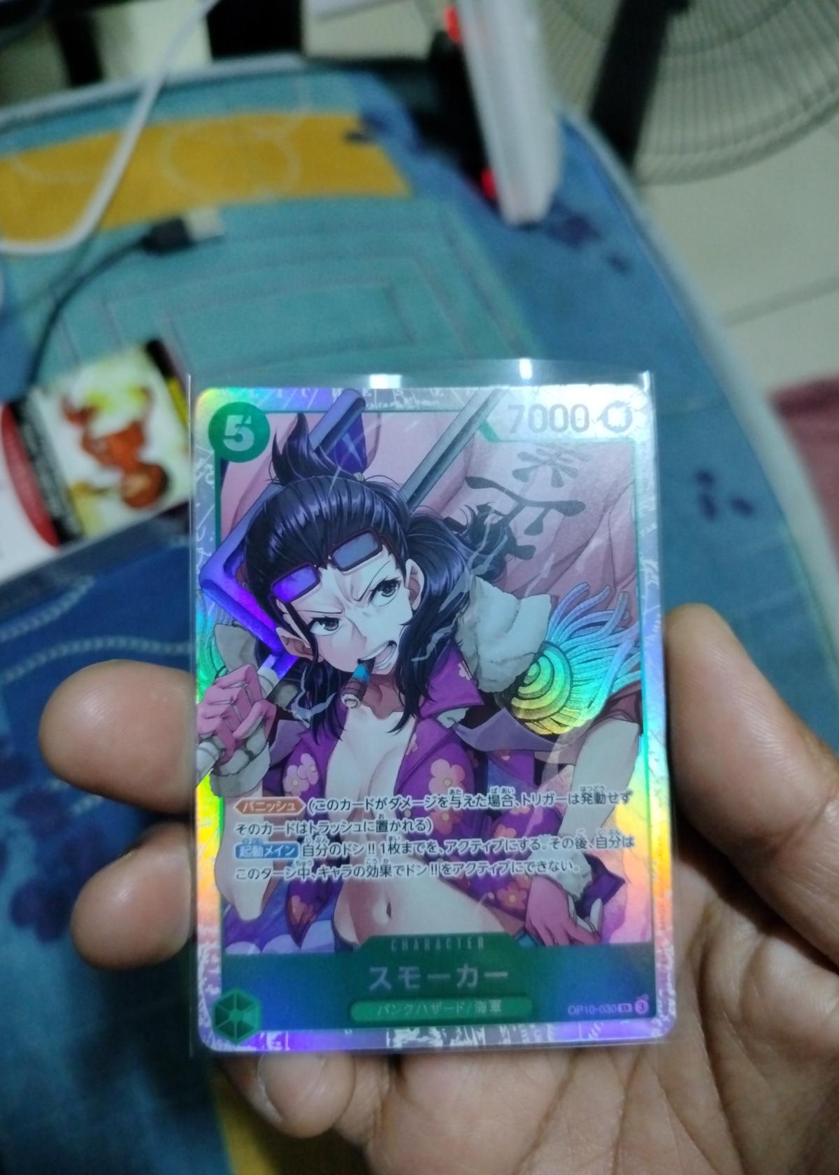 The card is ungraded but in near mint condition, with clean edges, vibrant colors, and beautiful holographic shine. This SR (Super Rare) status marks it as a standout in decks or binders, and its appealing presentation will be a highlight of any One Piece TCG collection. While playability within the Japanese meta may vary, Smoker cards tend to see regular demand due to their character appeal and versatility in deck-building. A must-have for fans of One Piece or collectors of high-quality Japanese TCG imports.