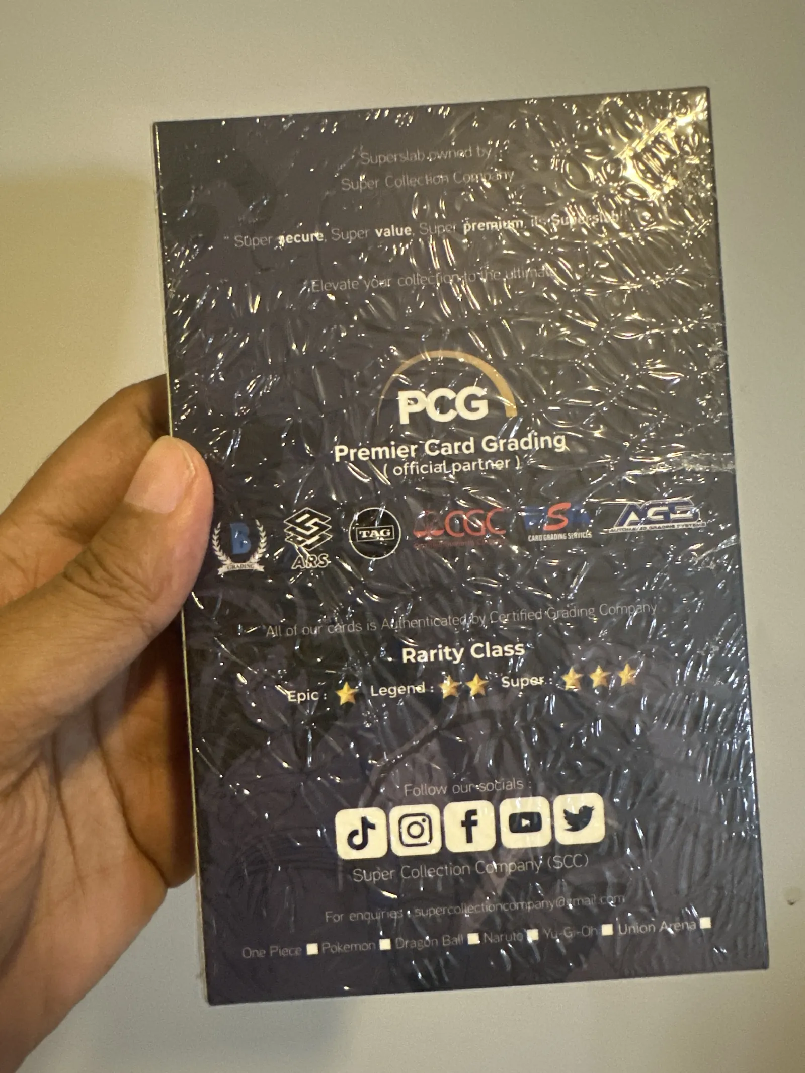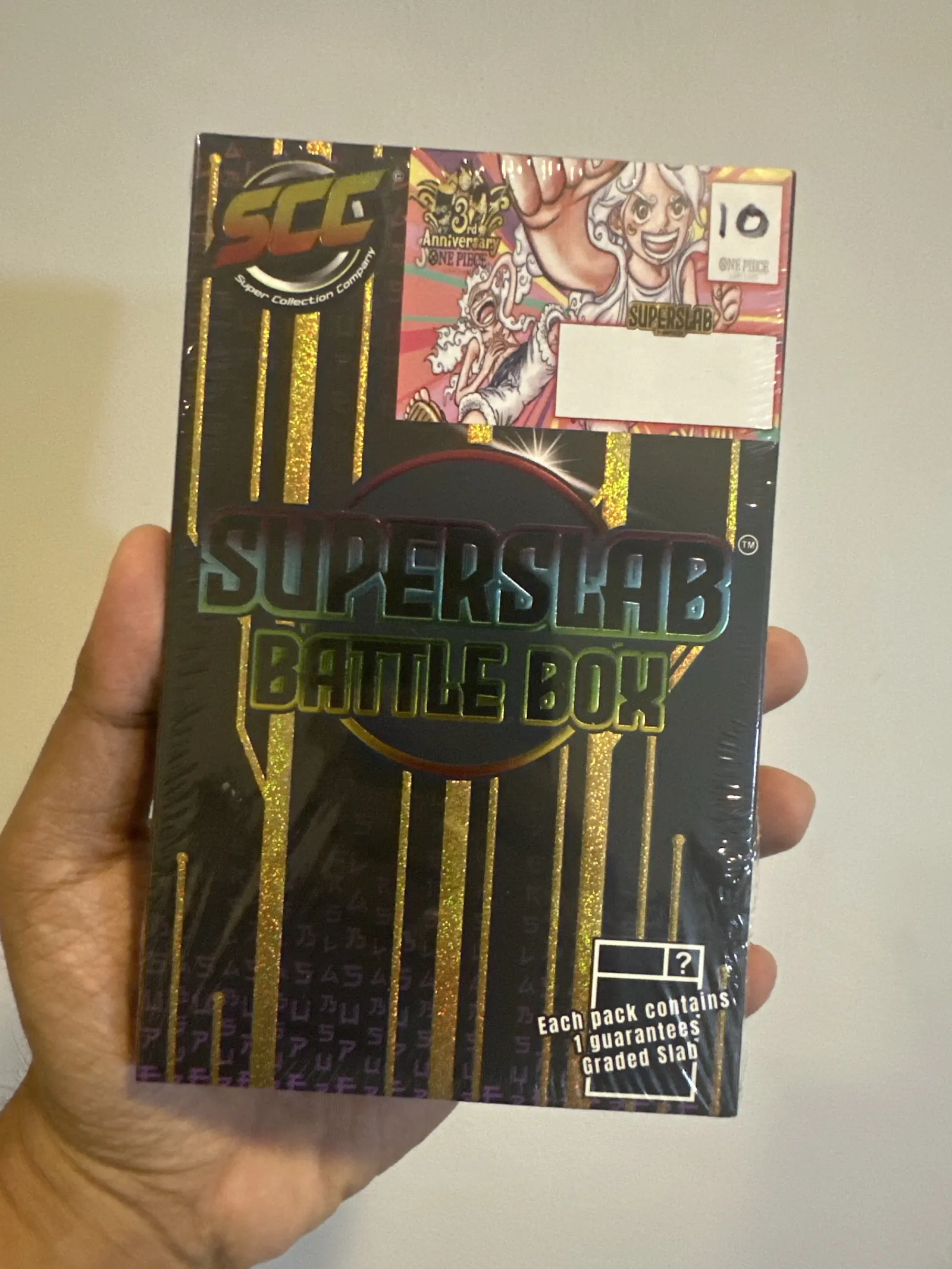 Superslab Battle Box One Piece by Super Collection Company (SCC), a collectible battle box that guarantees 1 graded slab card per box. Features authentic cards authenticated by certified grading companies such as PCG, CGC, PSA, and others. Suitable for collectors of One Piece, Pokemon, Dragon Ball, Naruto, Yu-Gi-Oh, and Union Arena cards. Packaging shows slight shelf wear but remains sealed and intact.