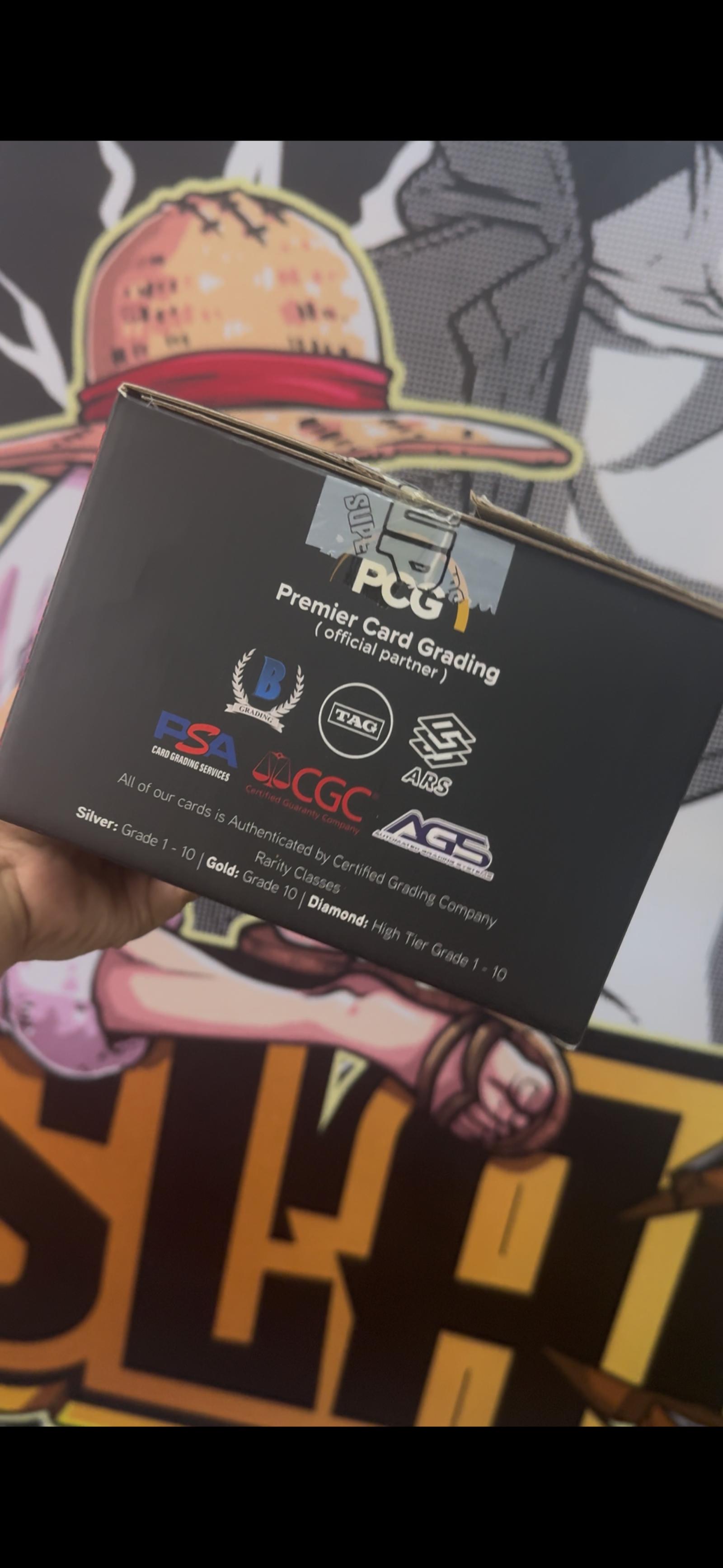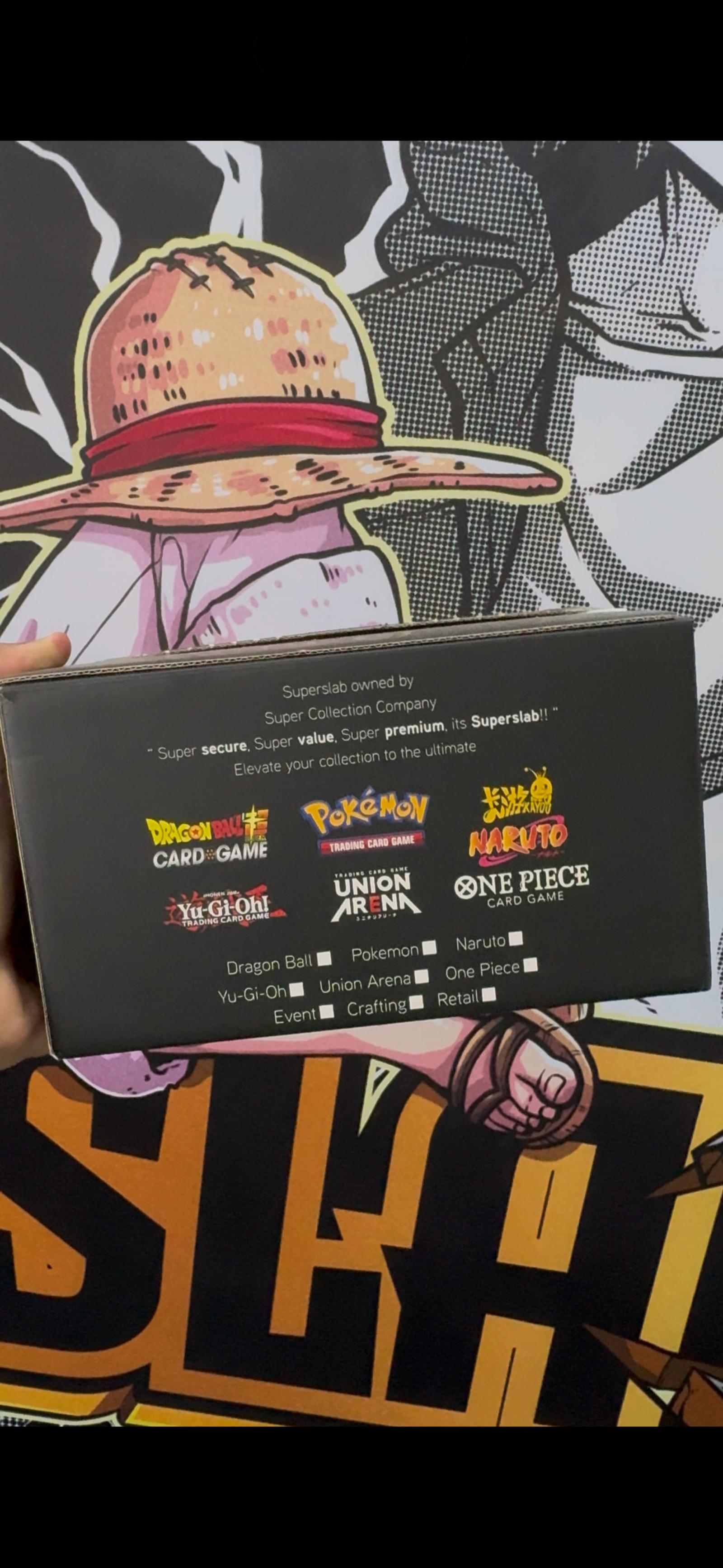 This Superslab box contains 10 graded slabs for the One Piece Trading Card Game. Owned by Super Collection Company, it offers secure, premium protection for your valuable cards, elevating your collection to the next level. Perfect for serious collectors and graders.