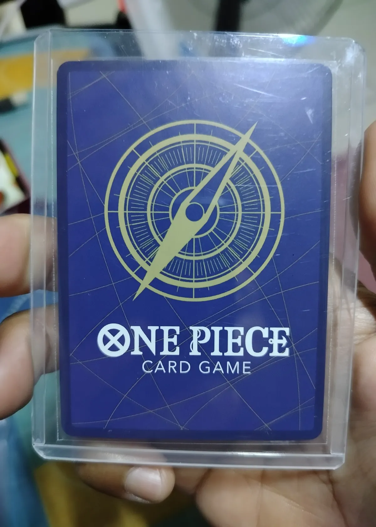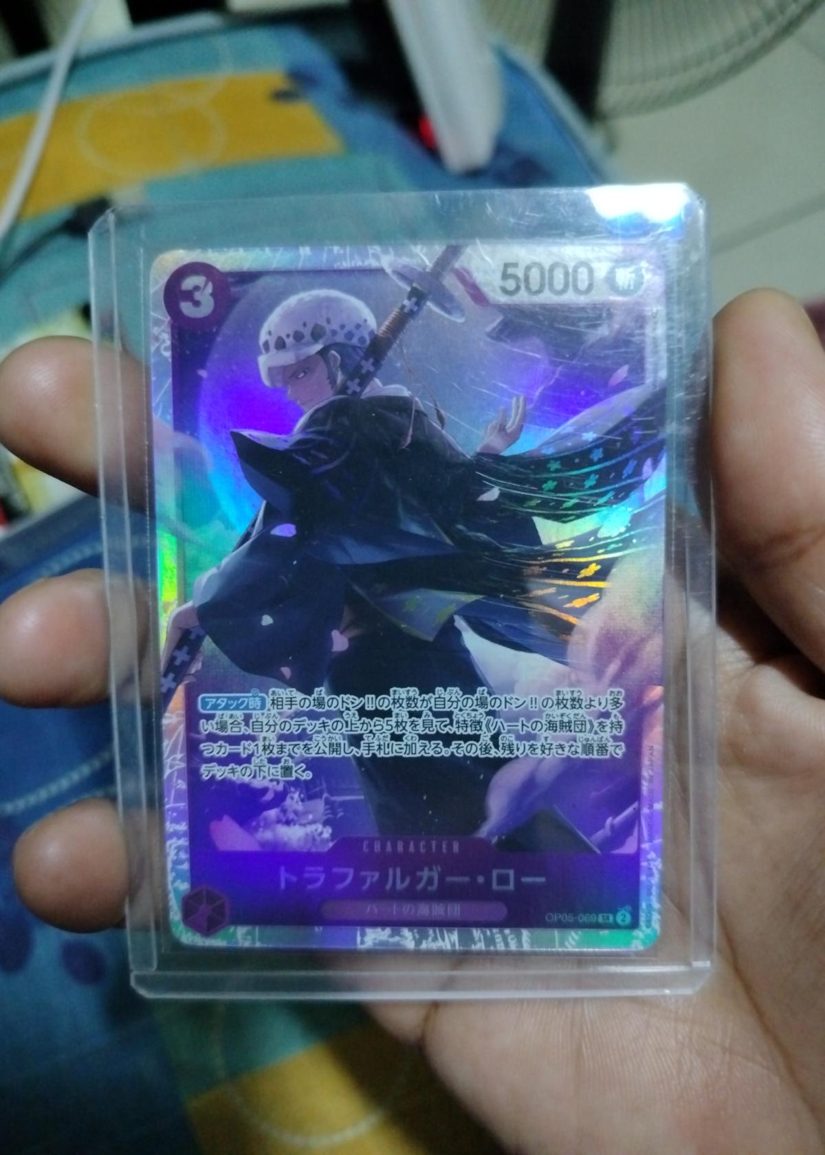 The card text is in Japanese, retaining authenticity for those who appreciate original releases. It has been carefully stored in a plastic protective sleeve to preserve its sharp corners, rich color, and premium quality. Trafalgar Law is a fan-favorite character, and SR cards like this are highly sought after, especially in such well-maintained condition.
