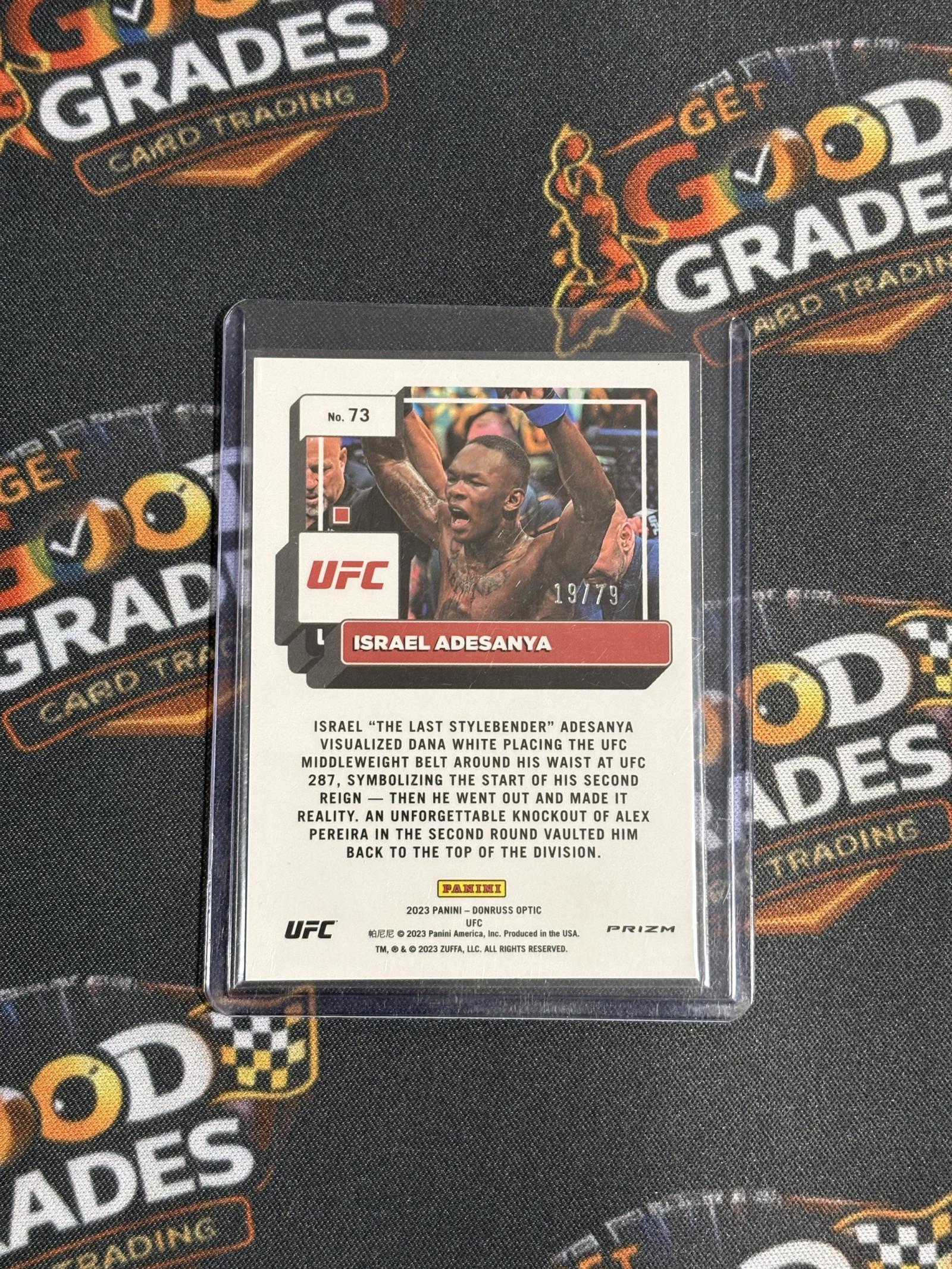 2023 Panini Donruss Optic UFC #73 featuring Israel Adesanya. This limited edition purple prizm card is numbered 19/79. The card highlights Israel "The Last Stylebender" Adesanya as Middleweight Champion symbolizing his second reign. The card is a collectible and part of the Donruss Optic set, produced by Panini America. Not a Pokémon TCG card, so not playable in the Pokémon meta.