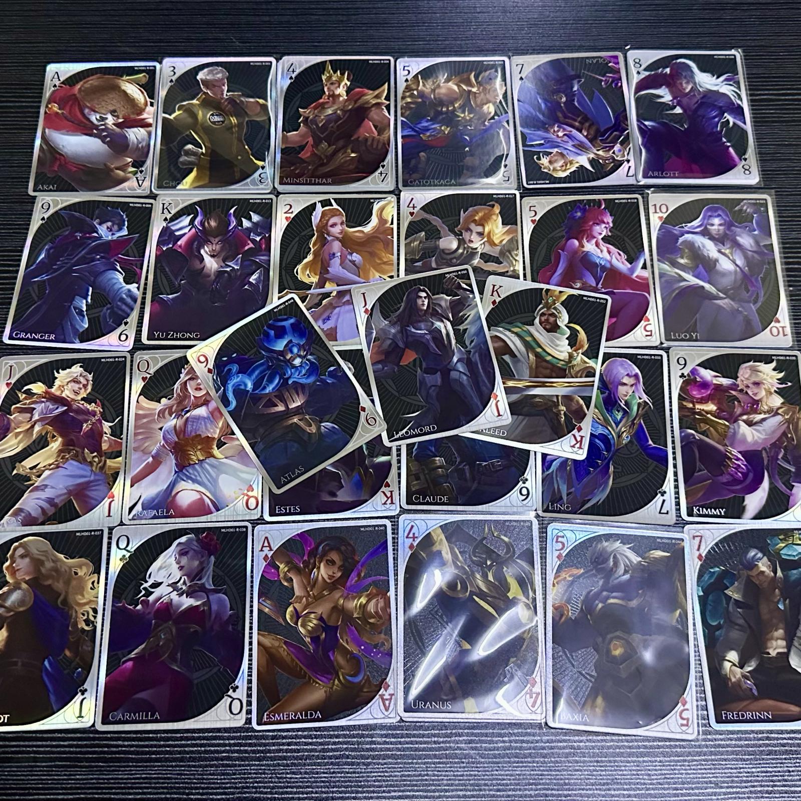 Mobile Lagends Bang Bang - Hand Of Destiny. A full set of playing cards featuring characters from Mobile Legends, designed with high-quality artwork. The set includes all suits and face cards, showcasing popular heroes such as Akai, Minstithar, Claude, and more. Perfect for collectors and fans of the game, these cards can be used for gaming or display. Cards show slight handling wear but no major damage.