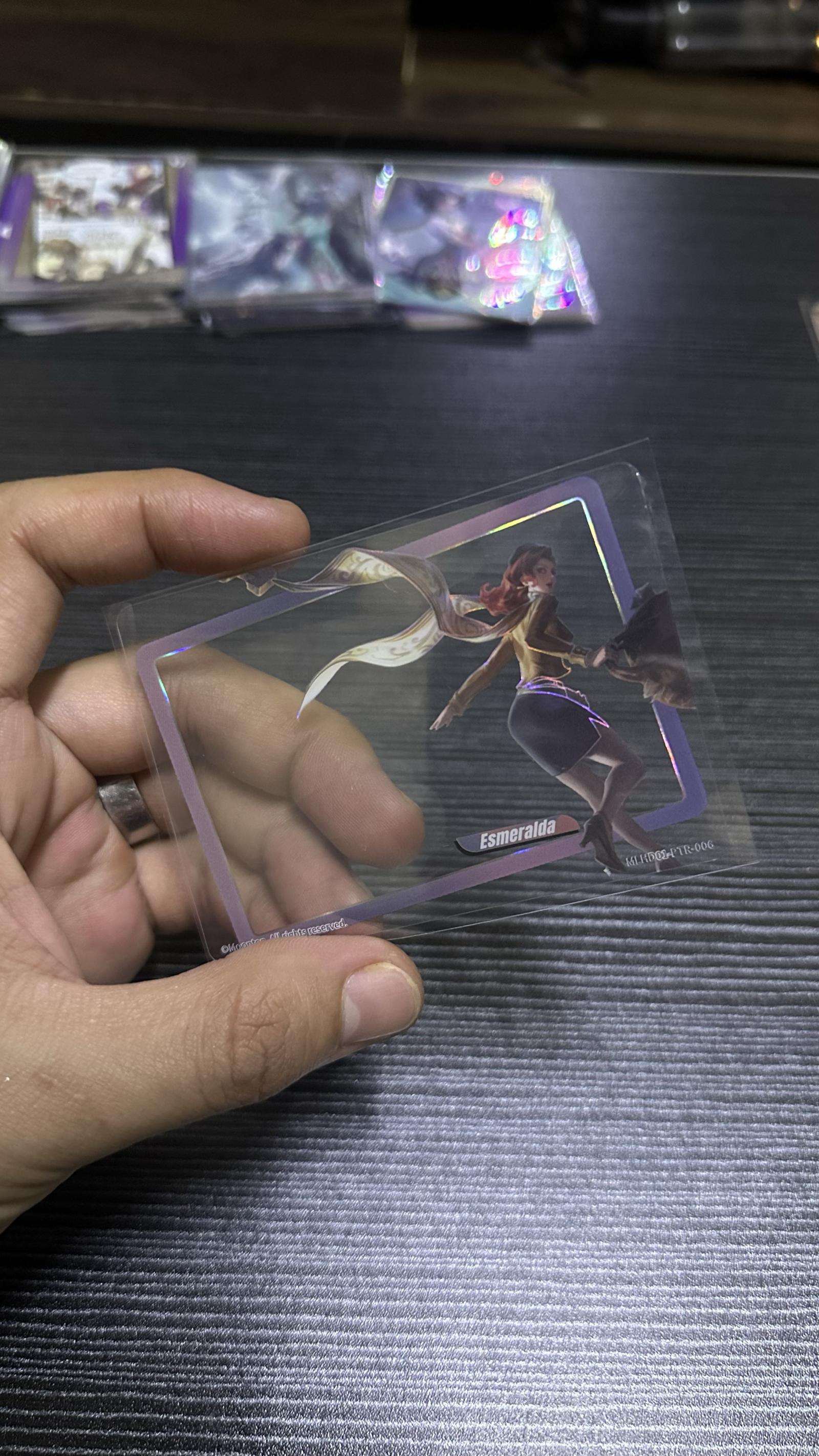 Mobile Lagends Bang Bang - Hand Of Destiny. A rare transparent holographic promo card featuring the character Esmeralda. The card shows no visible damage, scratches, or dents and is held in a protective sleeve. Ideal for collectors of unique or limited edition trading cards from various TCGs.