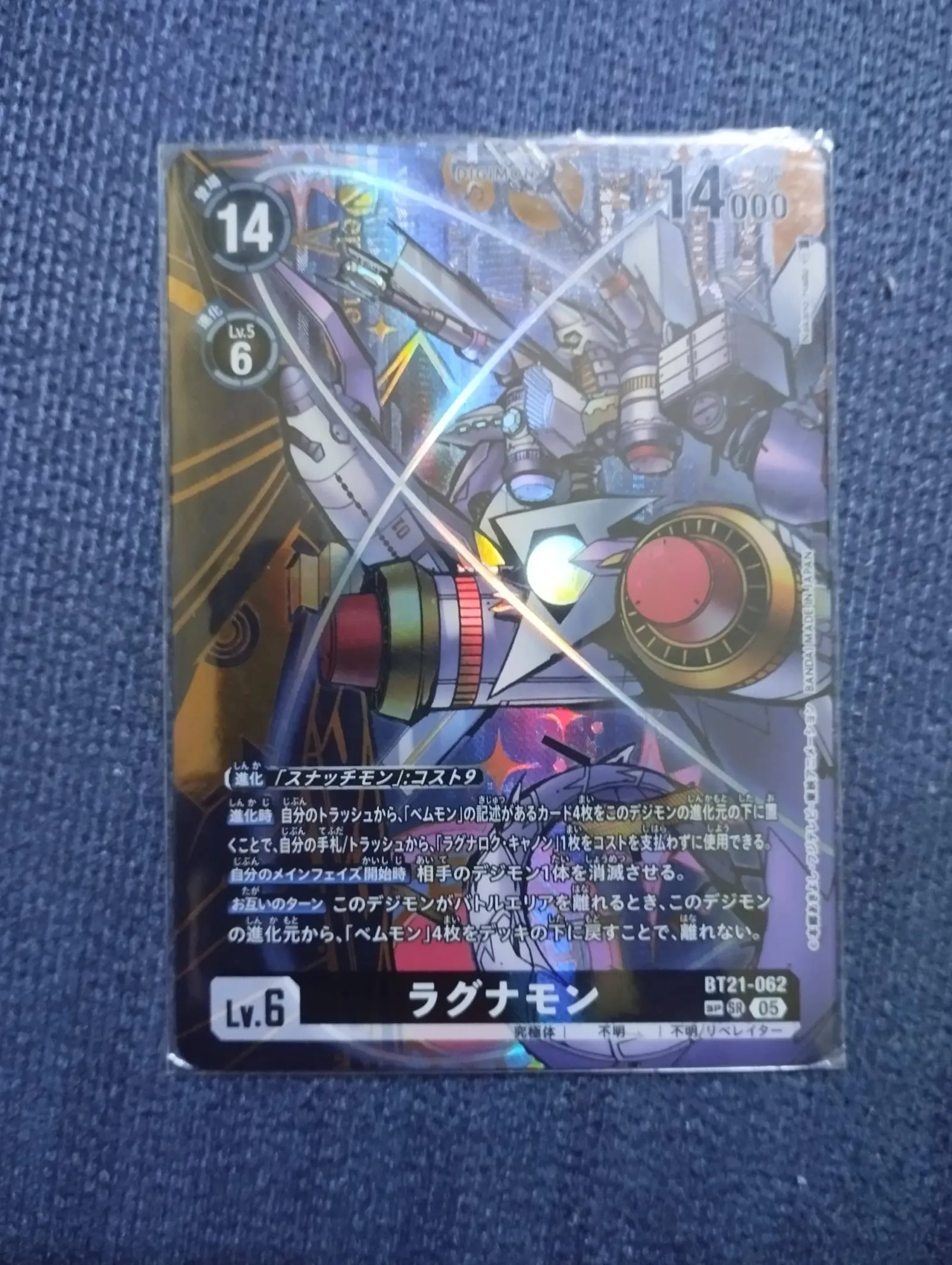 Playability & collectible value: Functionally this card is a Level‑6 Mega with a start‑of‑main‑phase removal and a digivolution interaction that references Vemmon and can enable a free‑use Ragnarok Cannon when its digivolution conditions are met. That gives it niche competitive value in Vemmon‑centric or Galactic decks. Collectibly, BT21 SP alternate‑art Megas are sought after for full‑art presentation and lower pull rates compared with regular prints; this variant’s visual presence and SP rarity make it desirable to both players who want a displayable game piece and collectors chasing alt‑art Megas.