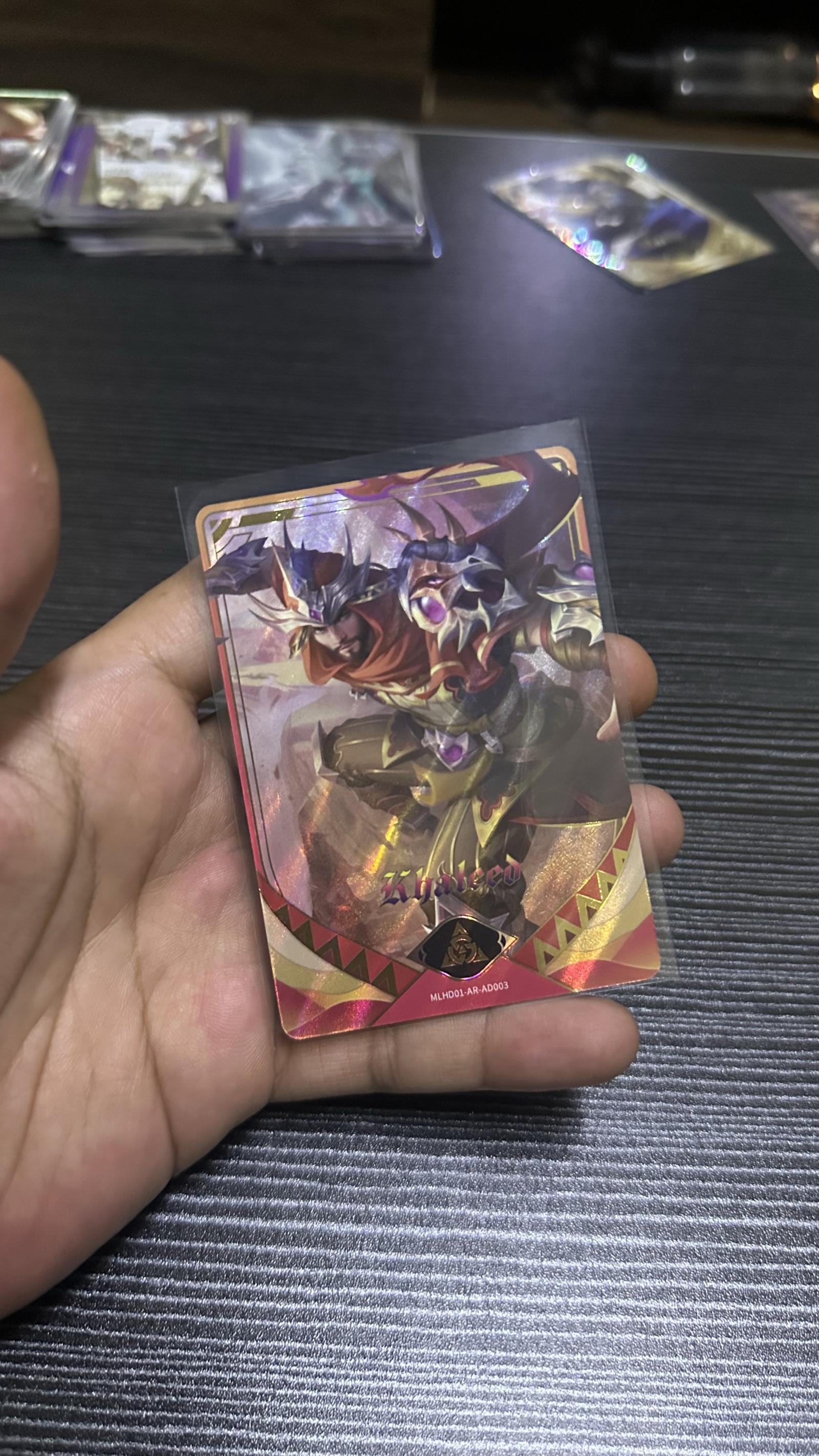 Mobile Lagends Bang Bang - Hand Of Destiny. A holographic collectible trading card featuring a fantasy warrior in detailed armor with vibrant colors and gold accents. The card is part of the MLHD01 series and is in a protective sleeve. Ideal for collectors of other trading card games seeking unique and visually striking cards.