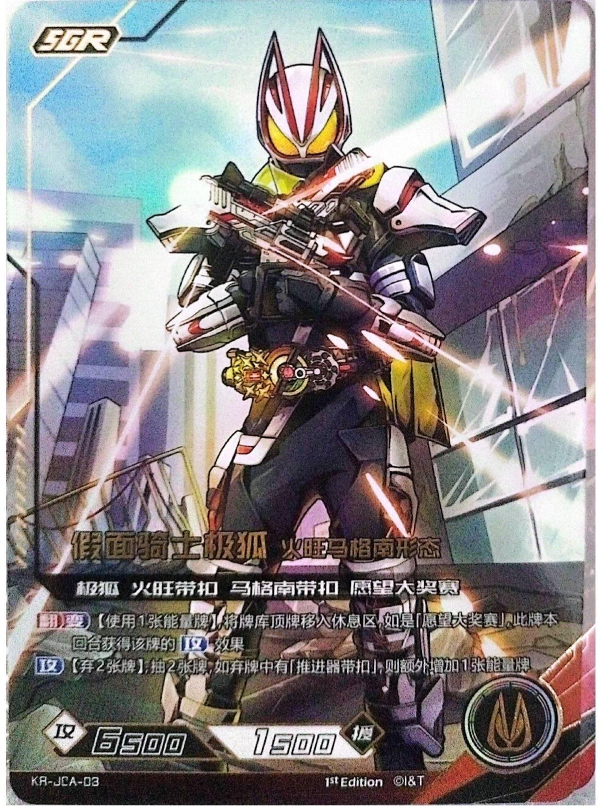 This Kamen Rider trading card from the Hero Battle X Kamen Rider Kayou series features the iconic Kamen Rider Geats Fever Magnum Form from Kamen Rider Geats Series with rarity SGR