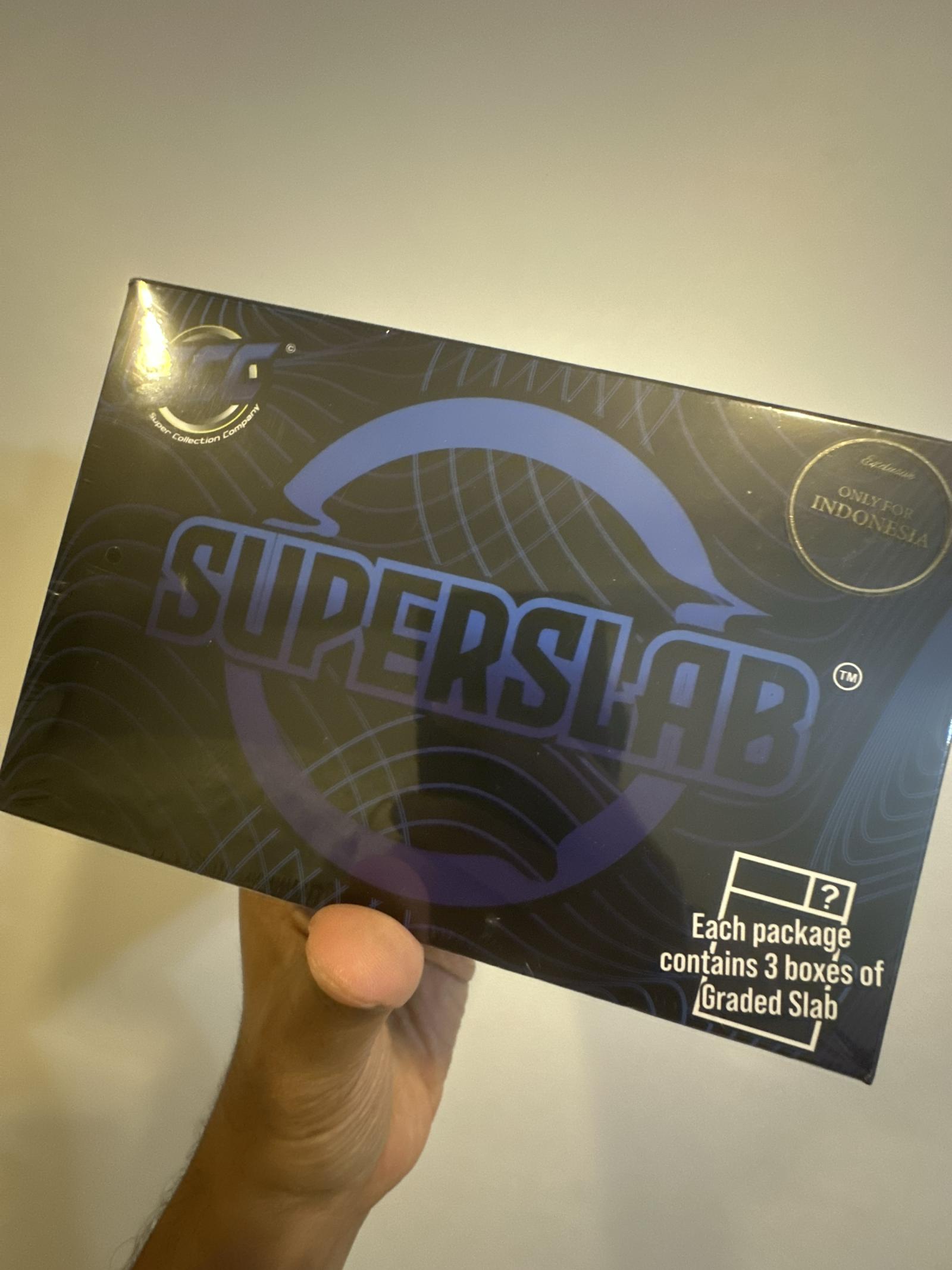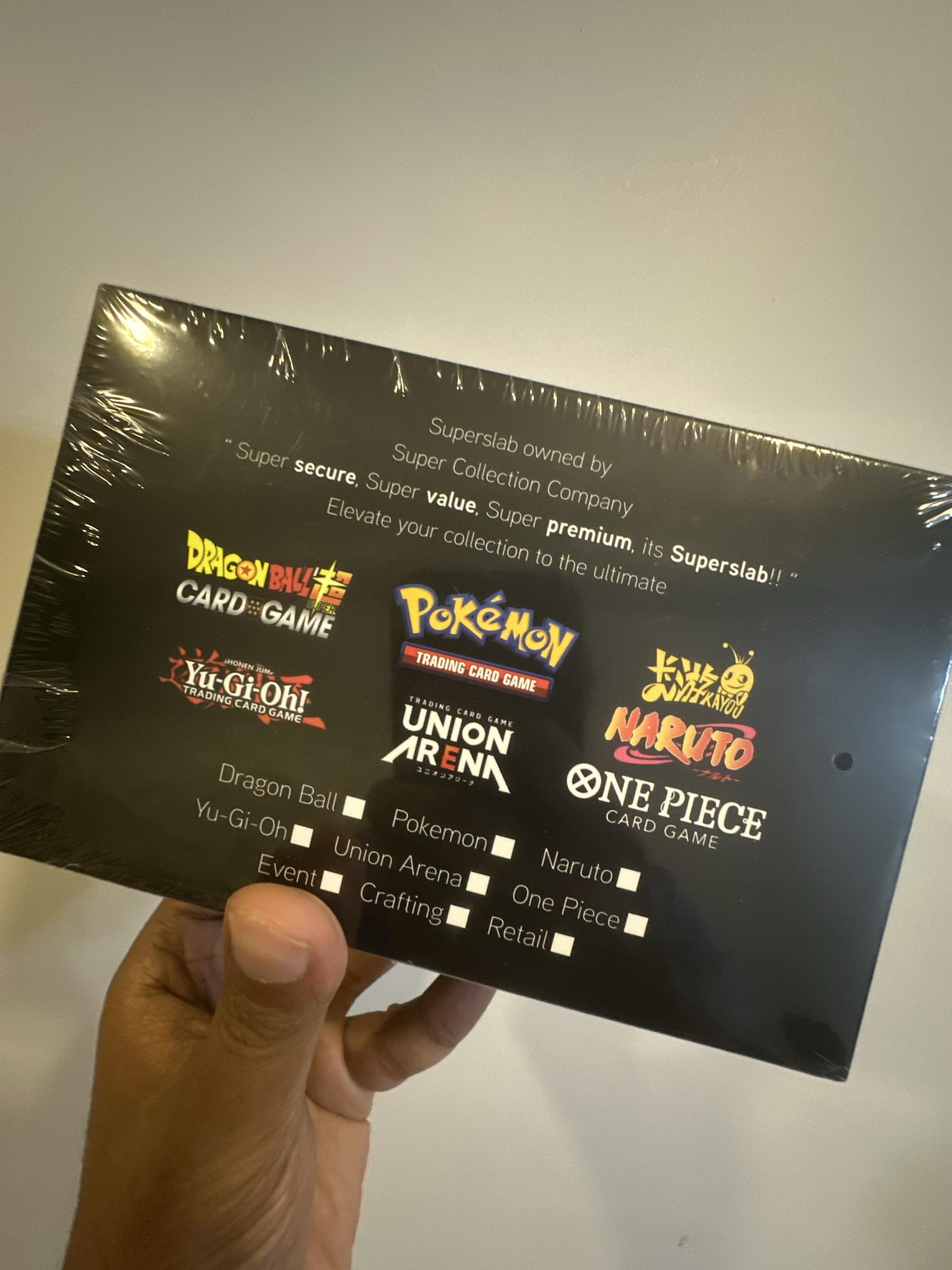 Sealed Superslab box containing 3 boxes of graded slab holders for trading cards such as Dragon Ball, Pokemon, Yu-Gi-Oh!, Naruto, One Piece, and Union Arena. Produced by Super Collection Company, this item elevates and protects your card collection with premium, secure holder boxes.