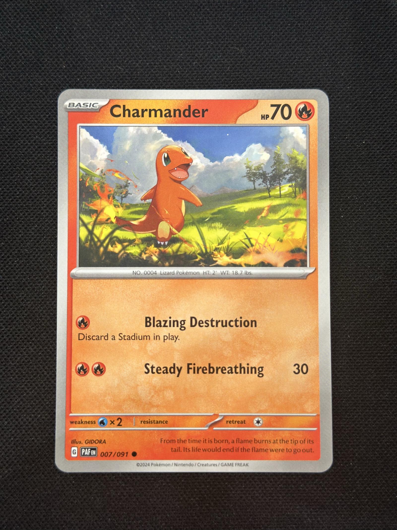 This is a Charmander Pokémon card from the 2024 PAF set, numbered 007/091. It features the attacks 'Blazing Destruction' and 'Steady Firebreathing' with 70 HP. The card shows a colorful illustration of Charmander in a sunny field. A great addition for Pokémon collectors and fans.