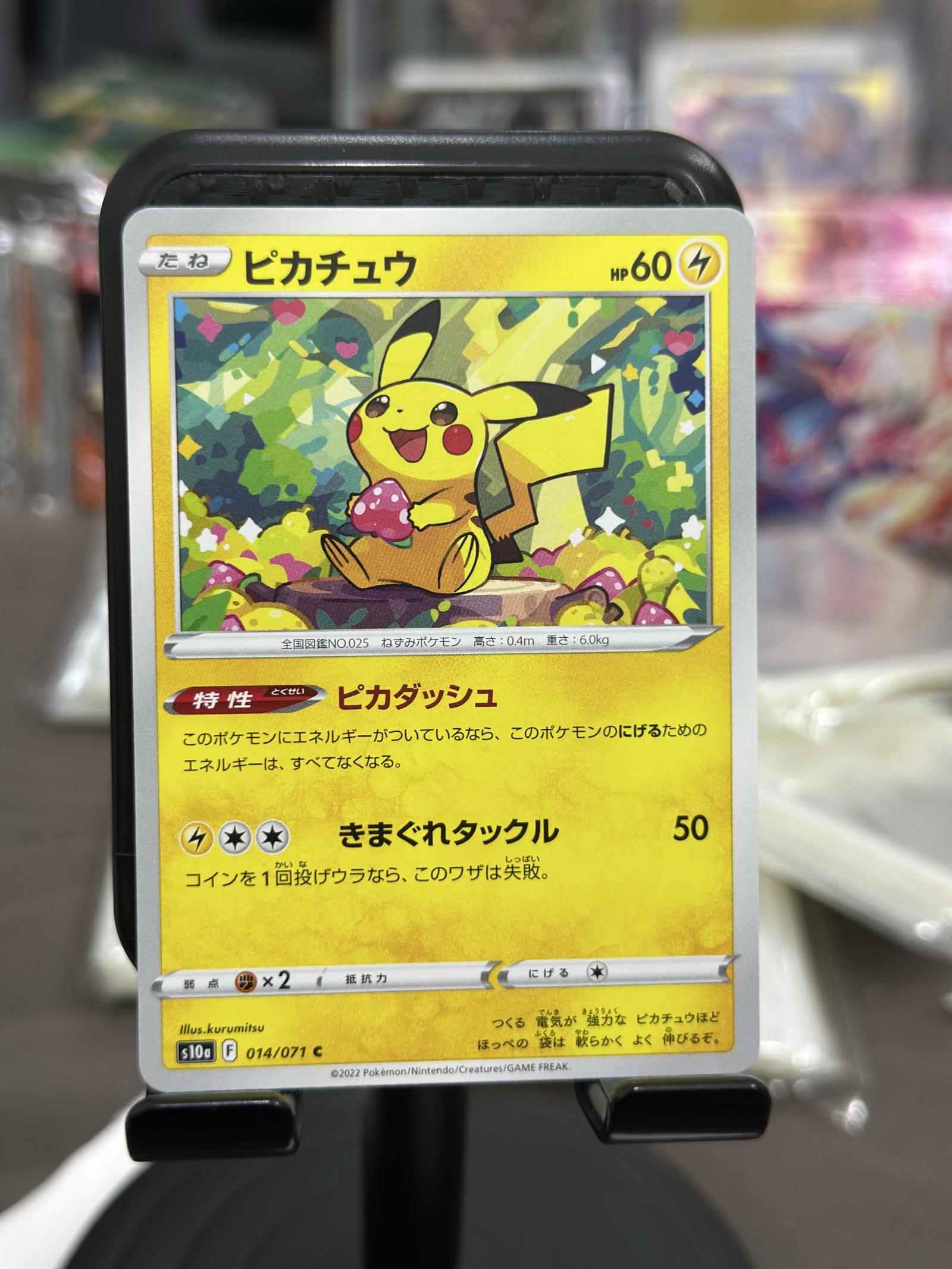 A Japanese Pikachu Pokémon trading card from the 2022 S10a series, number 014/071 F. The card features a colorful illustration of Pikachu holding a mushroom in a forest setting. Includes attack details and card stats in Japanese.