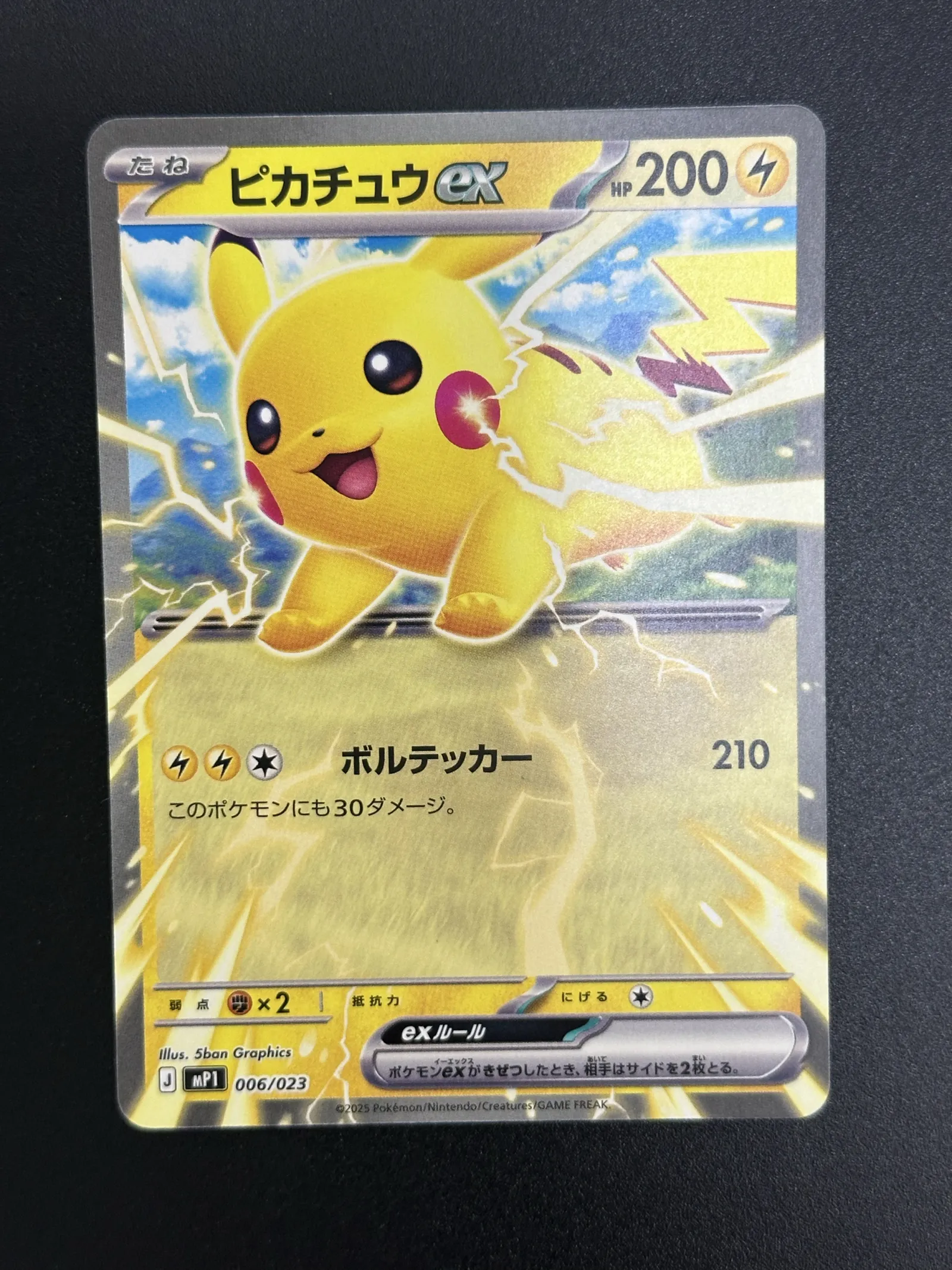 This is a Japanese Pikachu EX Pokémon card, numbered 006/023 with 200 HP. The card features a bright illustration of Pikachu surrounded by lightning effects. It has clear text in Japanese and is part of a recent 2025 release by Pokémon/Nintendo/Creatures/GAME FREAK. The card is suitable for collectors and players interested in Japanese Pokémon cards.