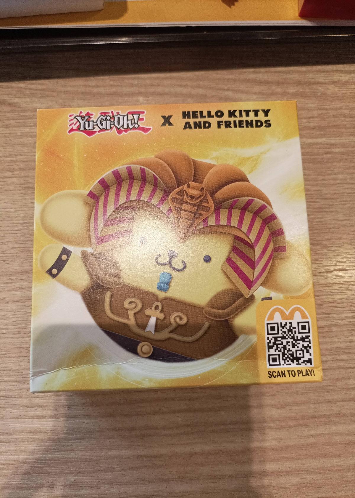 This collectible plush toy is part of the special 'Yu-Gi-Oh! x Hello Kitty and Friends' collaboration, available as a McDonald's exclusive. The plush features a character dressed as an ancient Egyptian Pharaoh, blending iconic elements of Hello Kitty and Yu-Gi-Oh! for a unique crossover. The product is still in its original box, making it ideal for collectors or fans of either franchise. Safety tested for children over 1 year, manufactured between October 30, 2023, and May 10, 2024. Languages on the box include English, Chinese, and Malay.