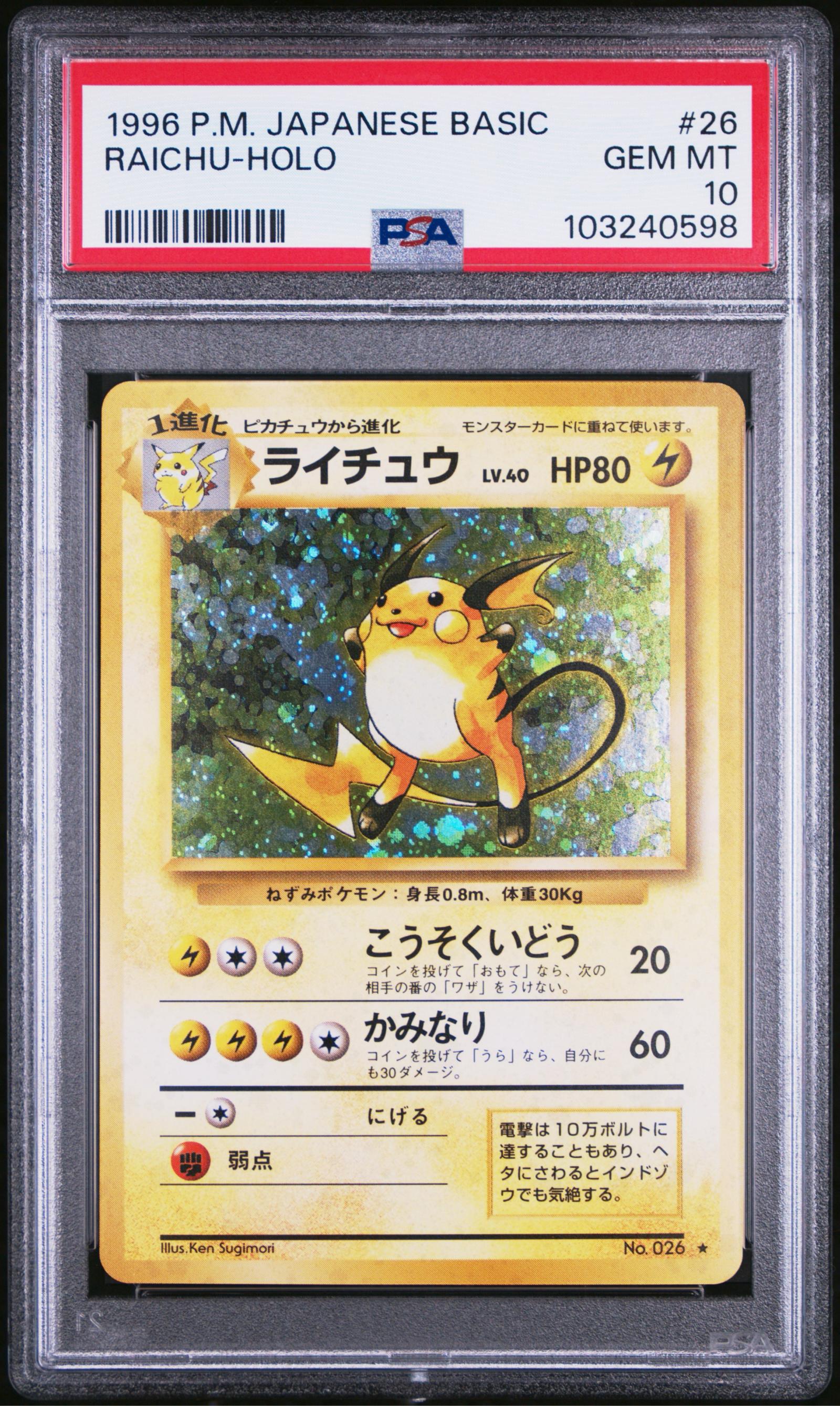 A 1996 Japanese Basic Raichu holographic card, numbered 026, from the original Japanese Pokemon set. Illustrated by Ken Sugimori, this card has been graded PSA GEM MT 10, signifying perfect condition. This rare holo card is a prized collector's item from the early days of the Pokemon TCG, primarily sought after for its collectibility and historical value. The card language is Japanese, making it a unique piece for collectors.