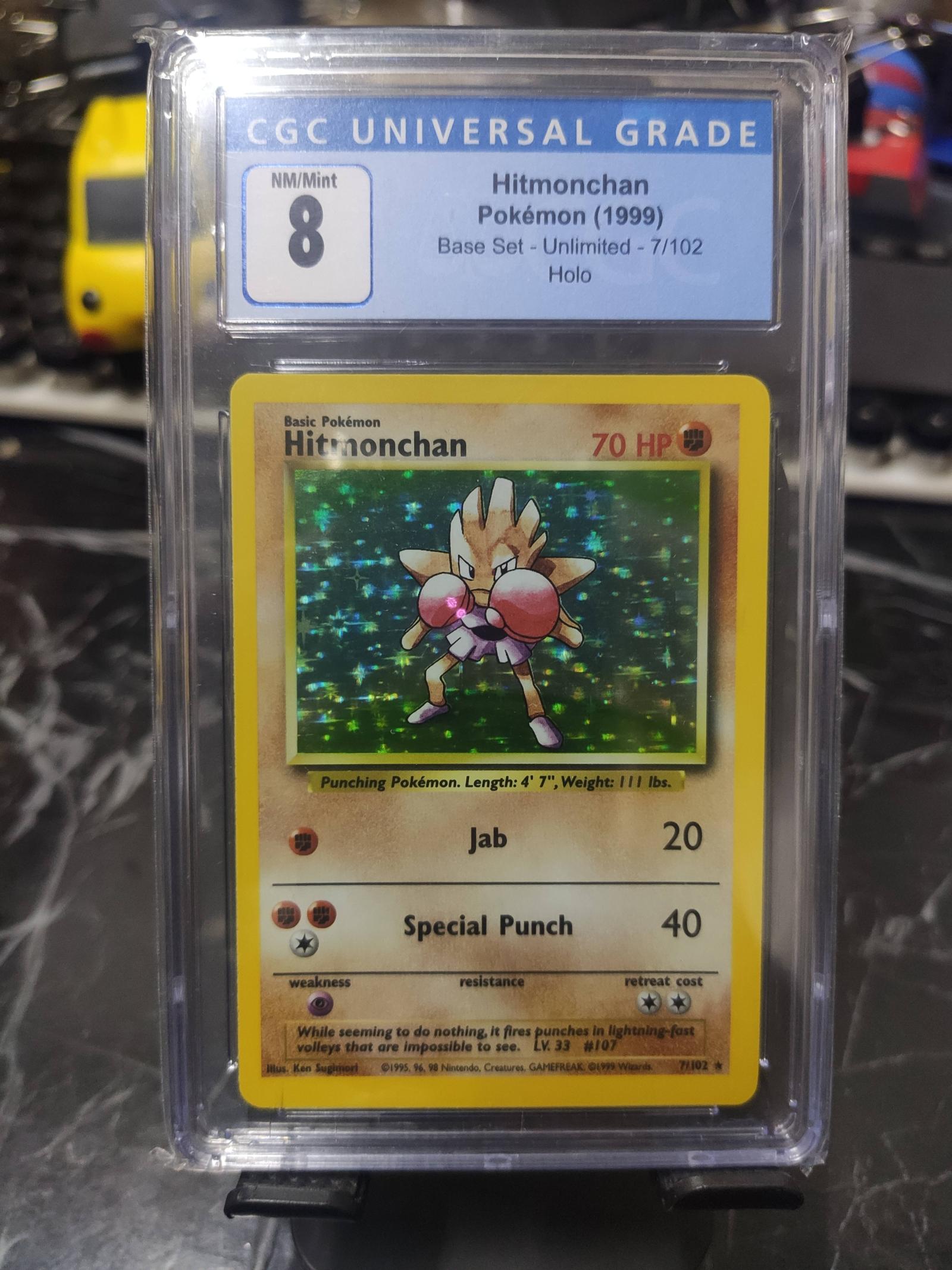 Hitmonchan 1999 Pokemon Base Set - Unlimited 7/102 Holo graded CGC NM/M 8. Illustrated by Ken Sugimori. This holofoil card from the Base Set Unlimited is collectible and playable in the Pokemon TCG meta. It is a well-preserved vintage card graded near mint/mint.
