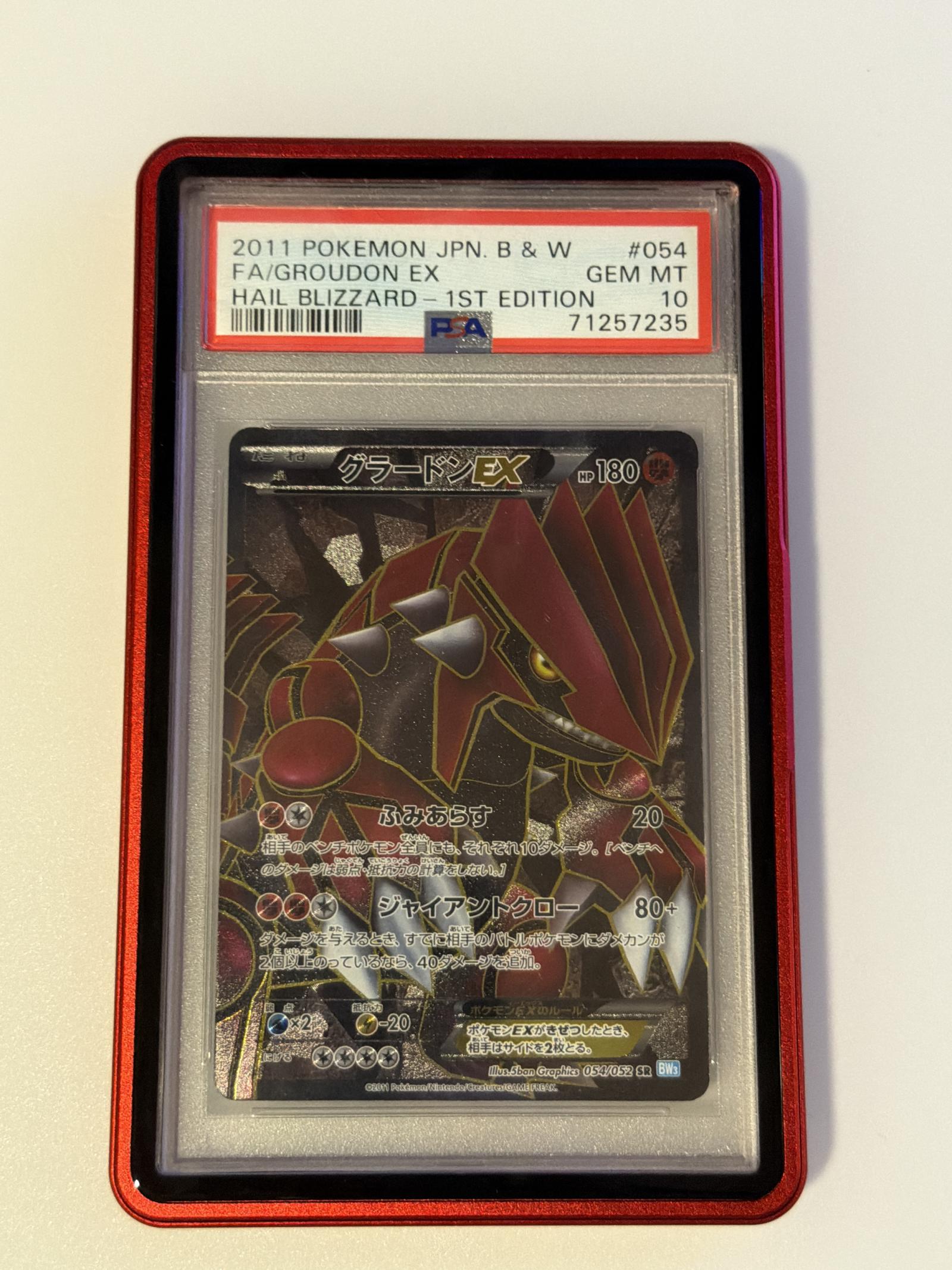 2011 Japanese Pokemon Black & White Hail Blizzard Groudon EX card, 1st Edition, graded PSA 10 GEM MT. Card number 054/052, foil alternate art. Illustrated by 5ban Graphics. This card is highly collectible due to its 1st edition status and PSA Gem Mint grading. Playability in meta is limited due to rotation but remains a prized collector's item.
