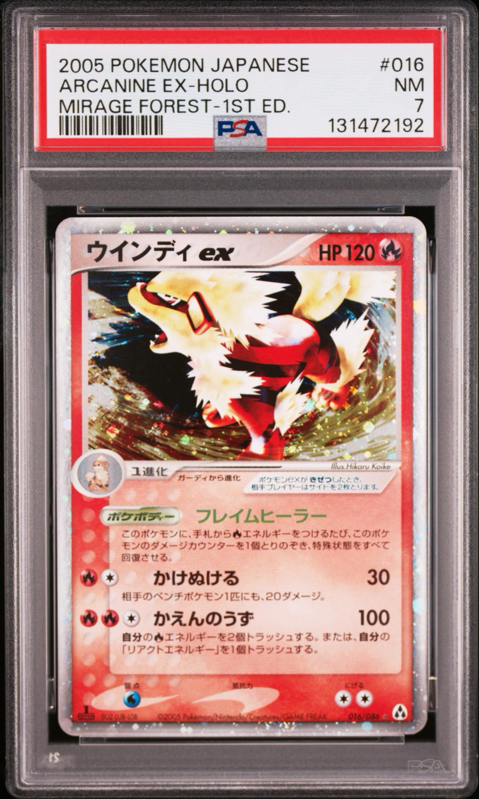 2005 Pokémon Japanese Arcanine ex from the Mirage Forest 1st Edition set. Card number 16/86. PSA graded NM 7. Illustrated by Hikaru Koike. This is a holo foil card and a collectible piece from the Pokémon EX series. Language: Japanese. The card is suitable mainly for collectors due to its vintage status and PSA grading.